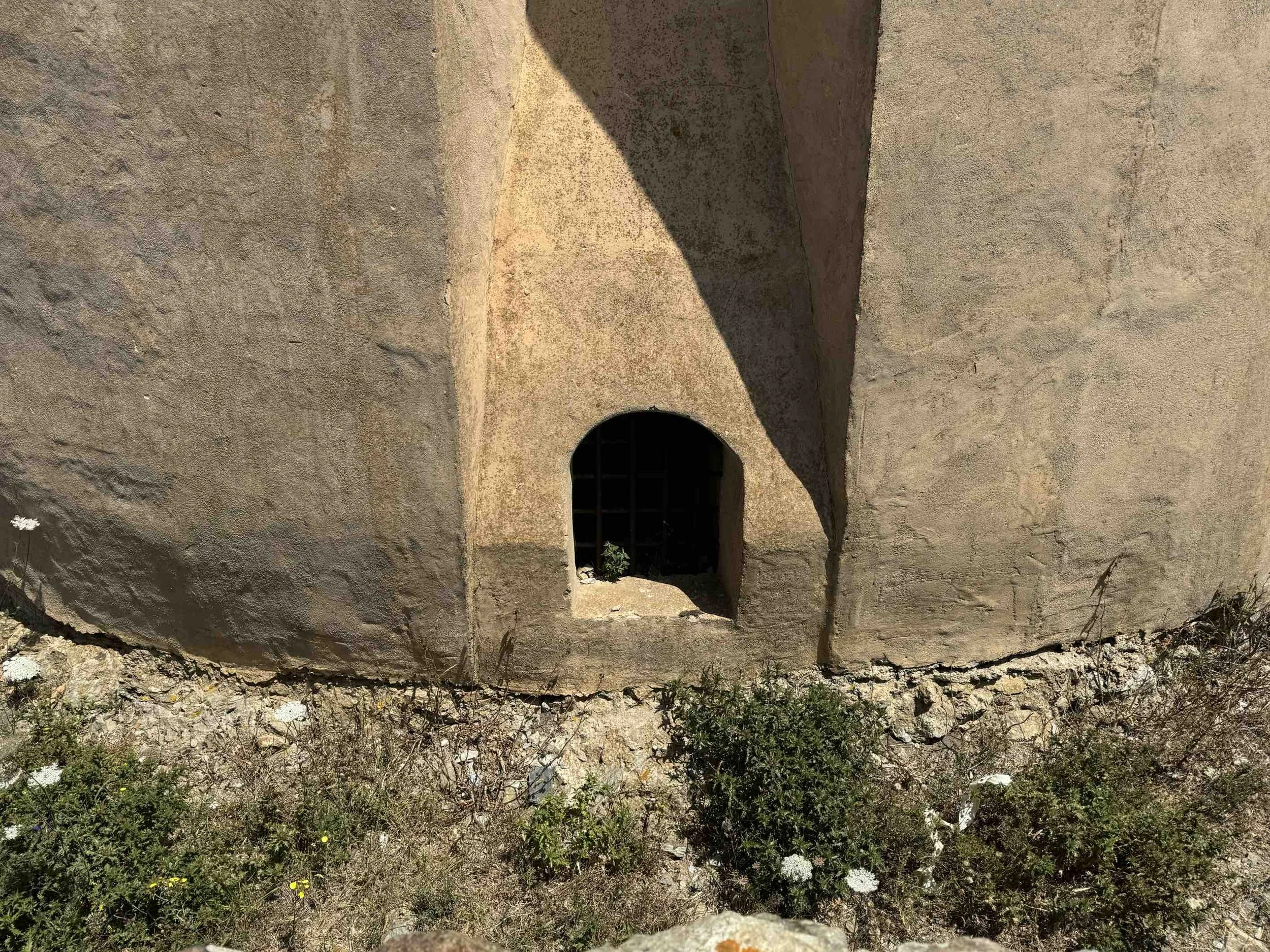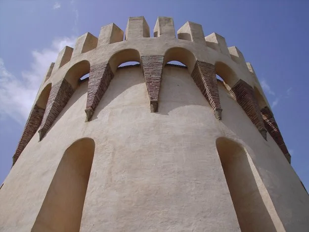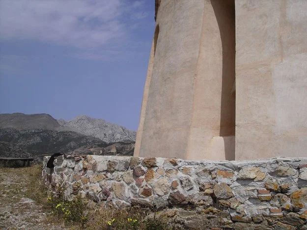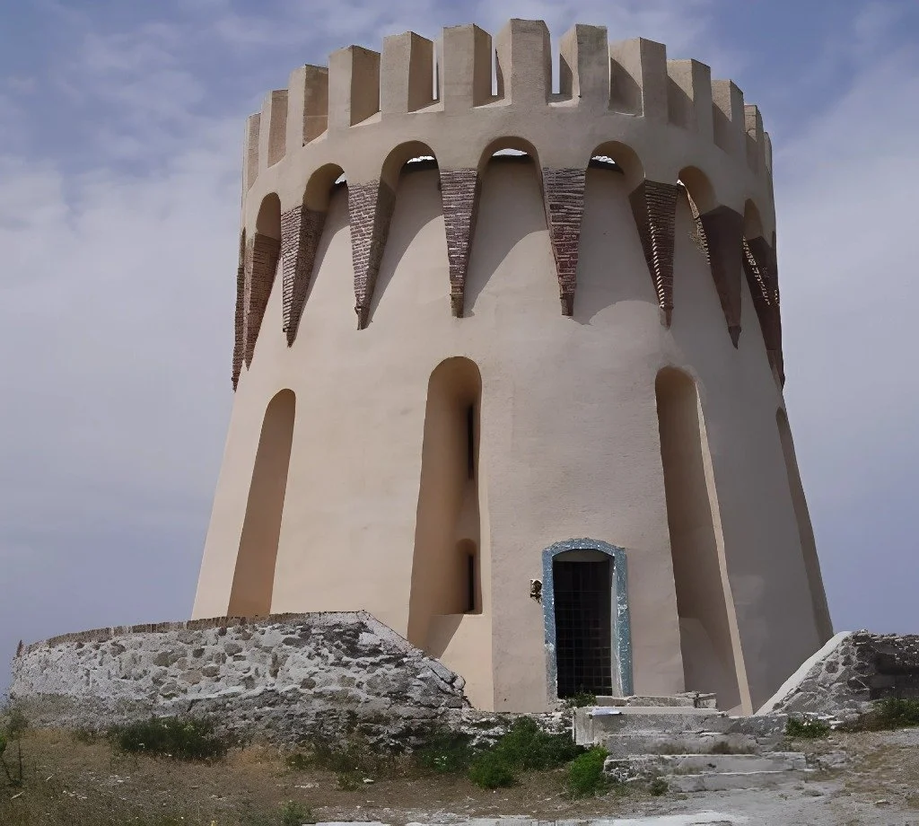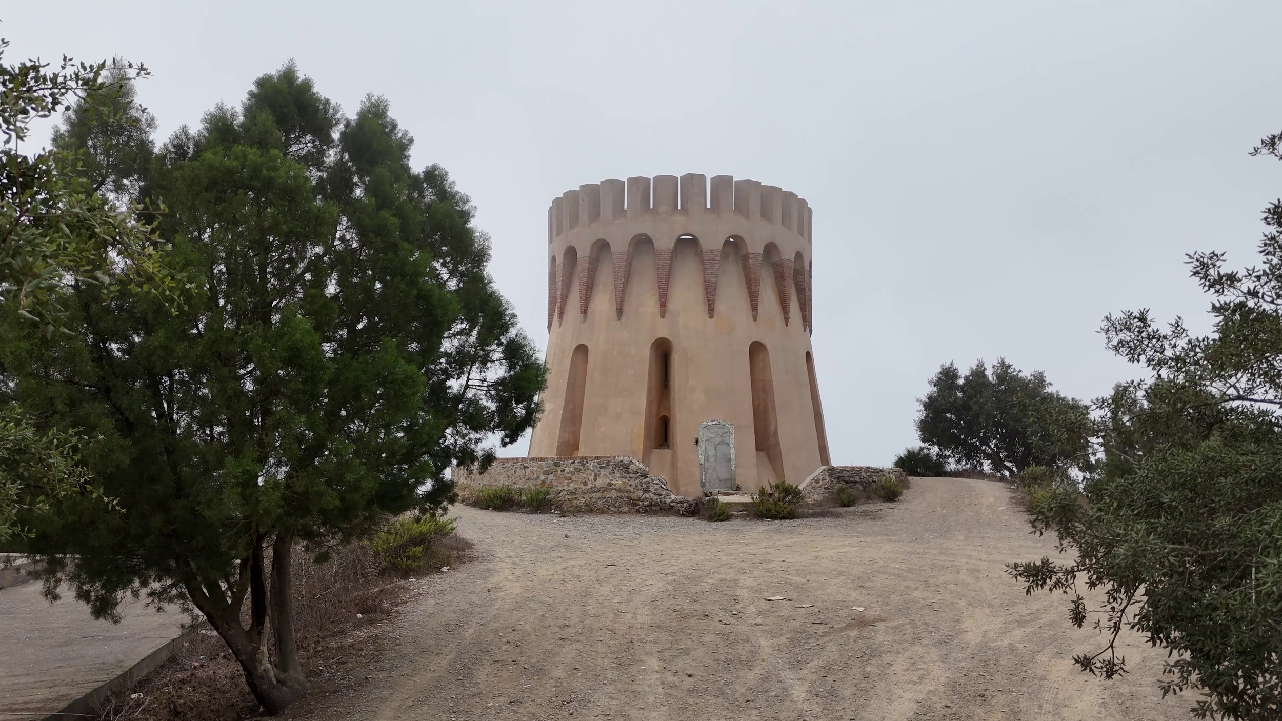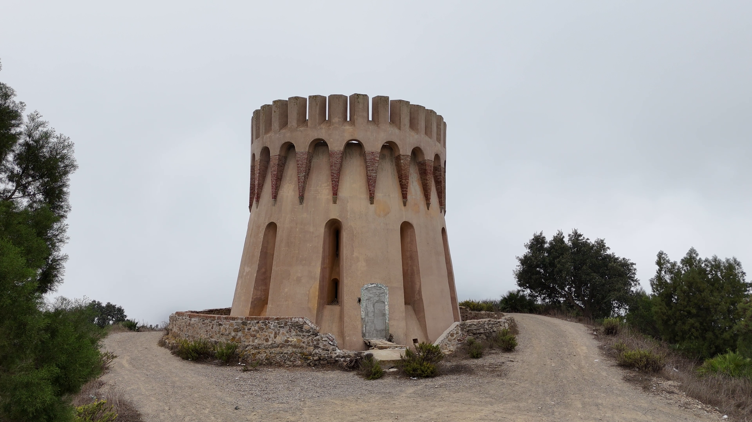 Sólido edificio de estilo neomedievalista de planta circular y estructura troncónica con altos muros coronados por almenas, en los que se abren troneras, arpilleras y matacanes, rodeado de un foso seco. En su interior existe un aljibe y las escaleras que acceden a las dos plantas superiores y al adarve. Construcción de la base con mampuesto de piedra y regularización alguna, hueco de escalera que da acceso a sótano, y de obra planta primera. Planta primera sin compartimentación, con gran escalera central de obra, que da acceso a cubierta. La cubierta con matacanes para el tiro y presencia de una garita.