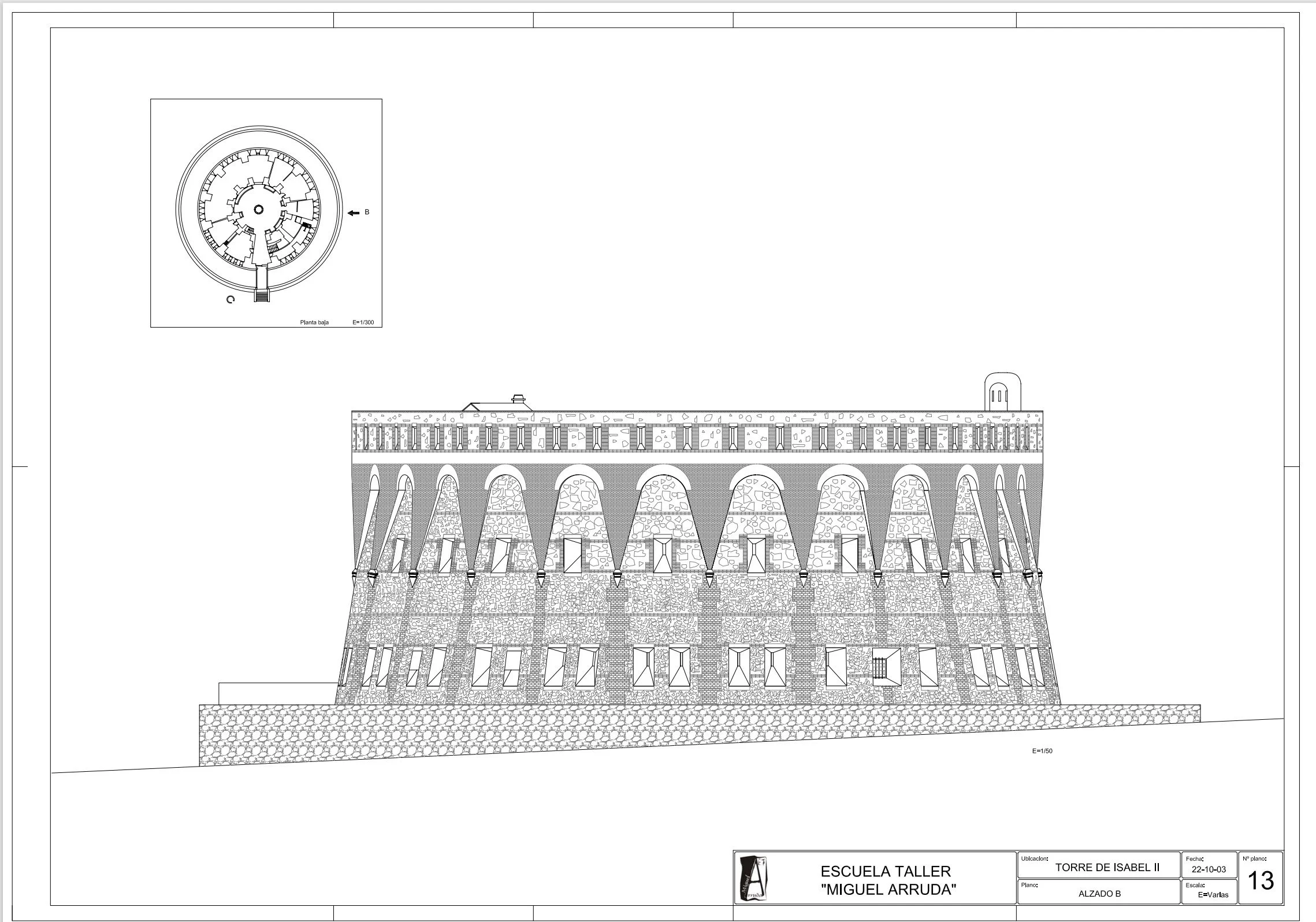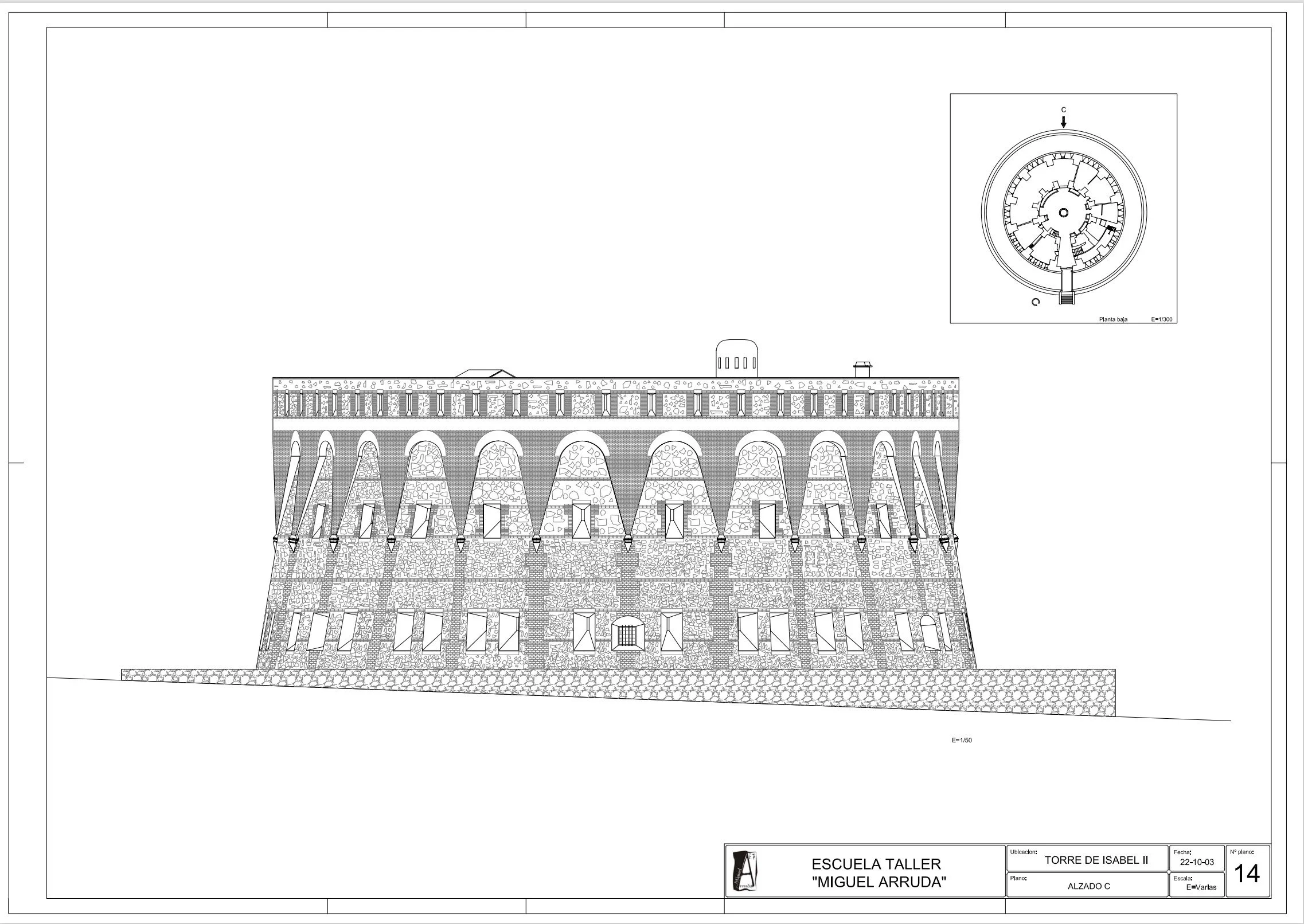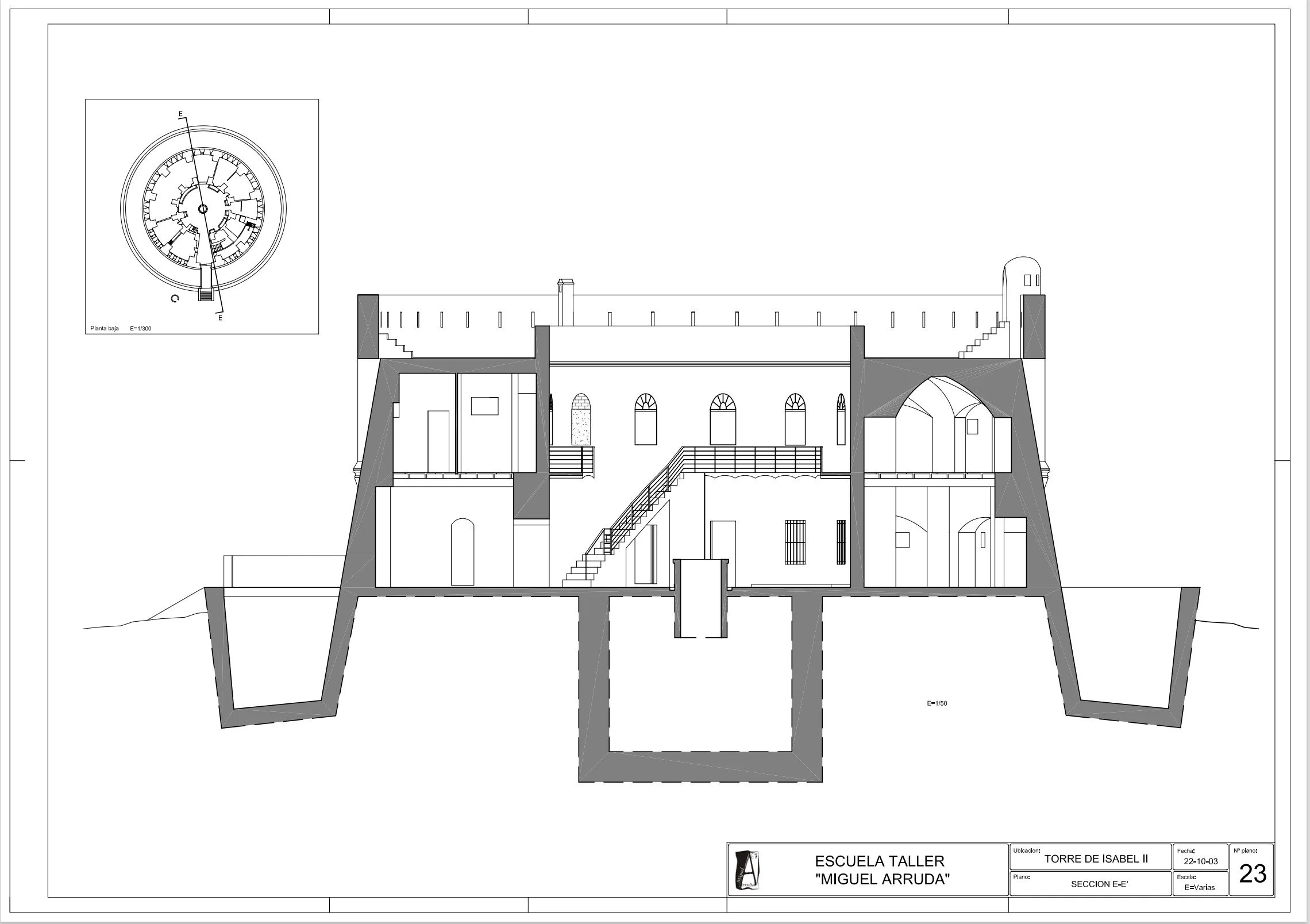 La Torre de Isabel II es troncónica de planta circular de 24 m de diámetro, desarrollada en planta baja, primera y cubierta. Todo el recinto se encuentra rodeada por un foso seco perimetral. El acceso al recinto se realiza mediante puente de losa de hormigón. En los muros exteriores se abren troneras (planta baja), arpilleras (planta primera), y matacanes en planta cubierta. Posee patio abierto interior; en planta baja se distribuyen las estancias necesarias para el uso de la tropa y pose igualmente un pozo-aljibe. Construida con mampuestos y ladrillo cerámico visto.