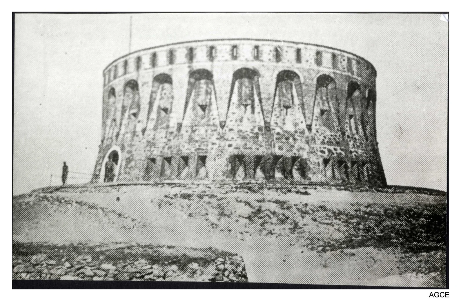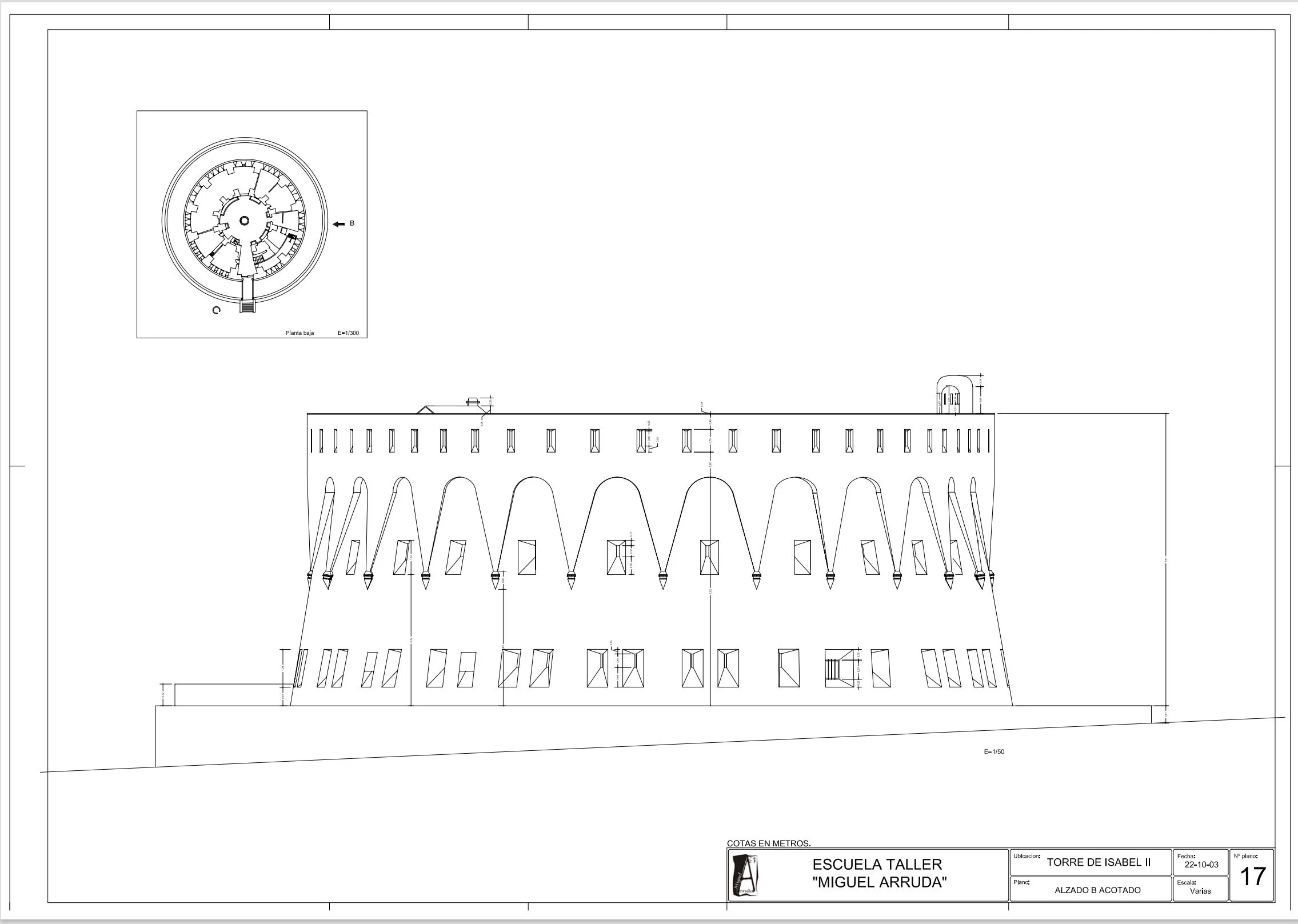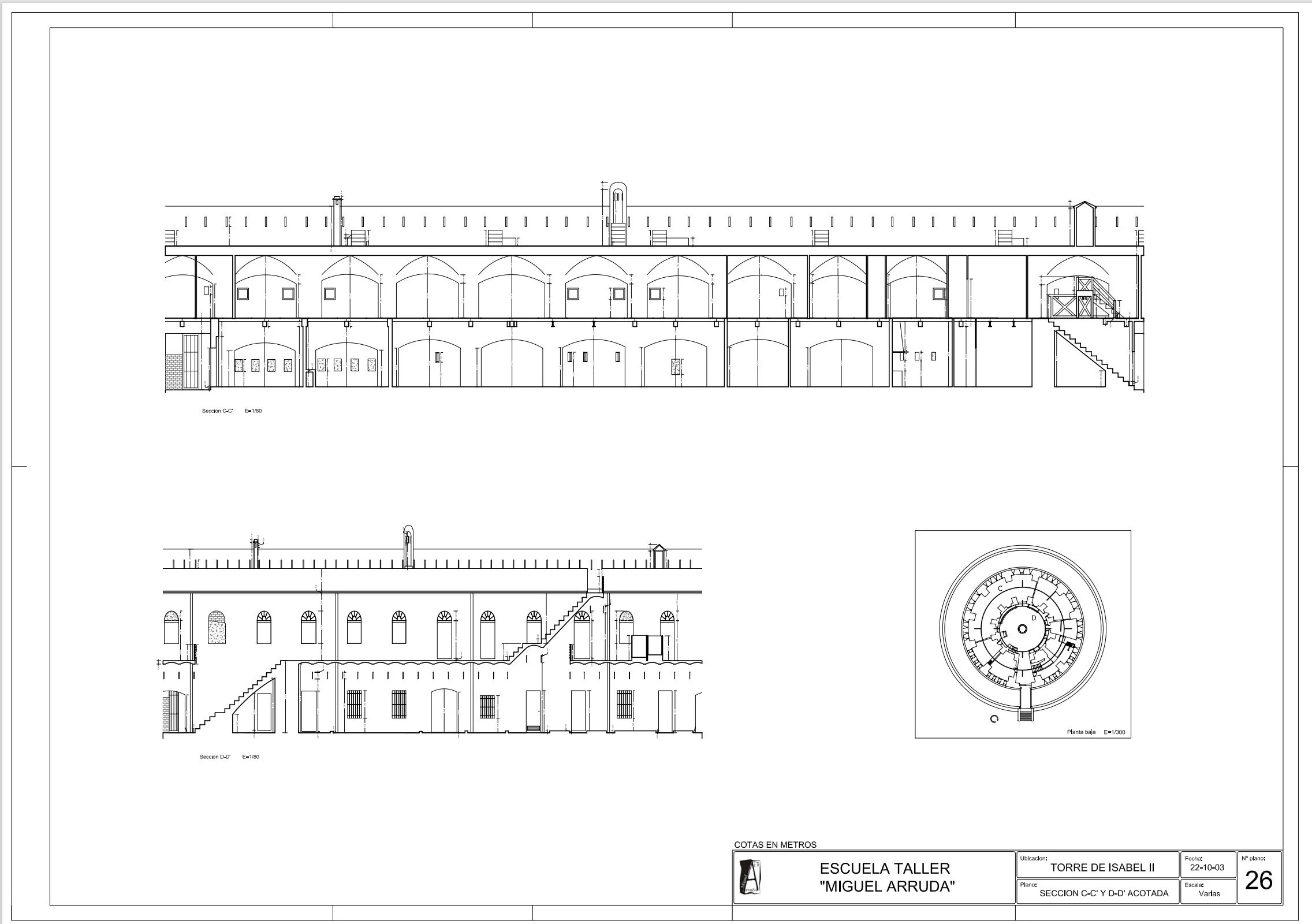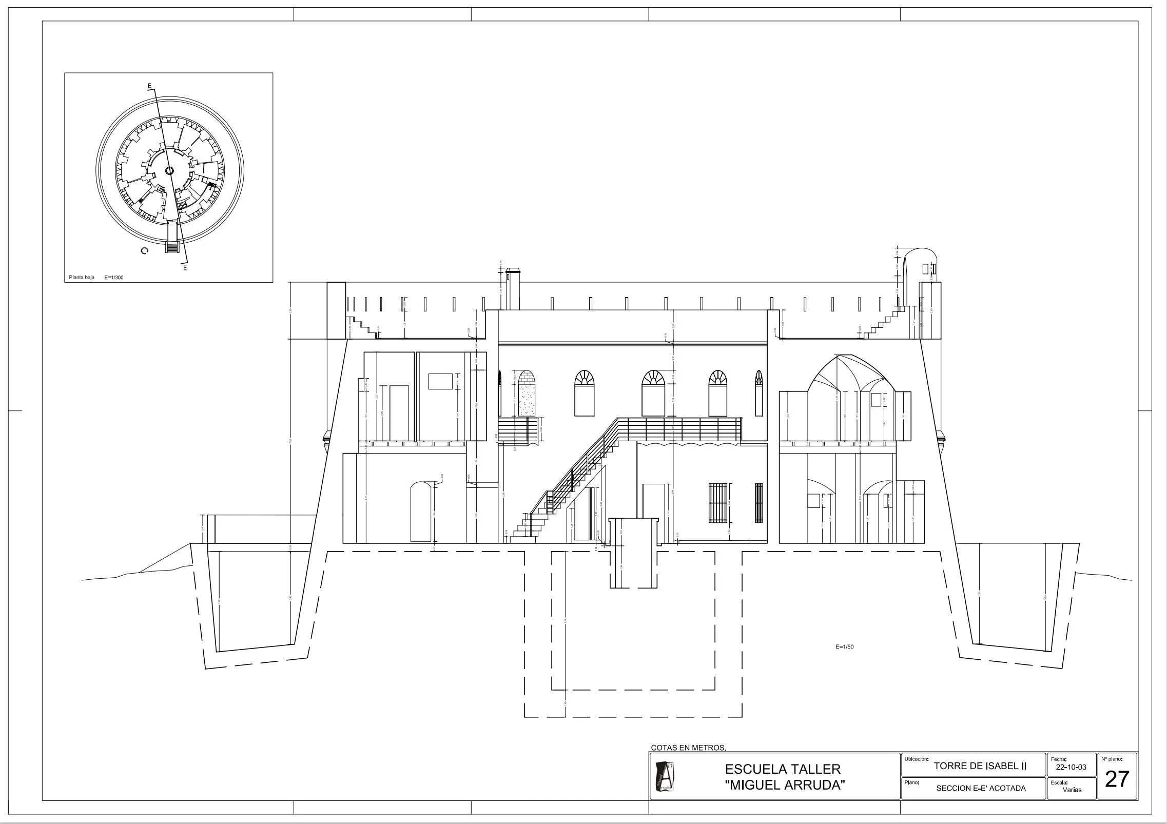 La Torre de Isabel II es troncónica de planta circular de 24 m de diámetro, desarrollada en planta baja, primera y cubierta. Todo el recinto se encuentra rodeada por un foso seco perimetral. El acceso al recinto se realiza mediante puente de losa de hormigón. En los muros exteriores se abren troneras (planta baja), arpilleras (planta primera), y matacanes en planta cubierta. Posee patio abierto interior; en planta baja se distribuyen las estancias necesarias para el uso de la tropa y pose igualmente un pozo-aljibe. Construida con mampuestos y ladrillo cerámico visto.