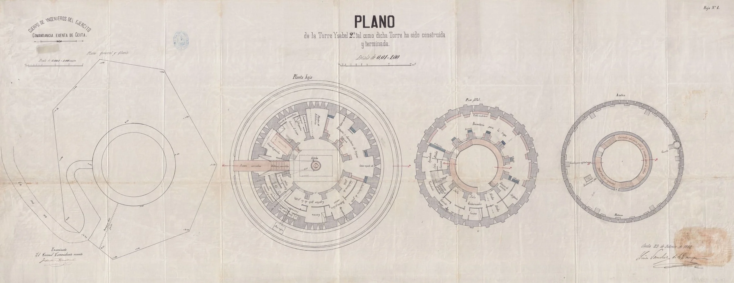 Por ello, y cumpliendo con el objetivo anteriormente descrito, durante los años 1860 y 1884, se construirían nueve fuertes, unidos por un sendero natural, y en los puntos más altos de Sierra Bullones, destinados a la vigilancia y defensa de la ciudad, y que de sur a norte son los siguientes: Fuerte del Príncipe Alfonso, Torre de Mendizábal, Torre de Piniés, Torre de Francisco de Asís, Torre de Isabel II, Torre de Yebel Anyera, Torre Renegado o Tortuga, Torre de Aranguren y Torre de Benzu.