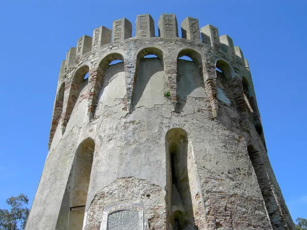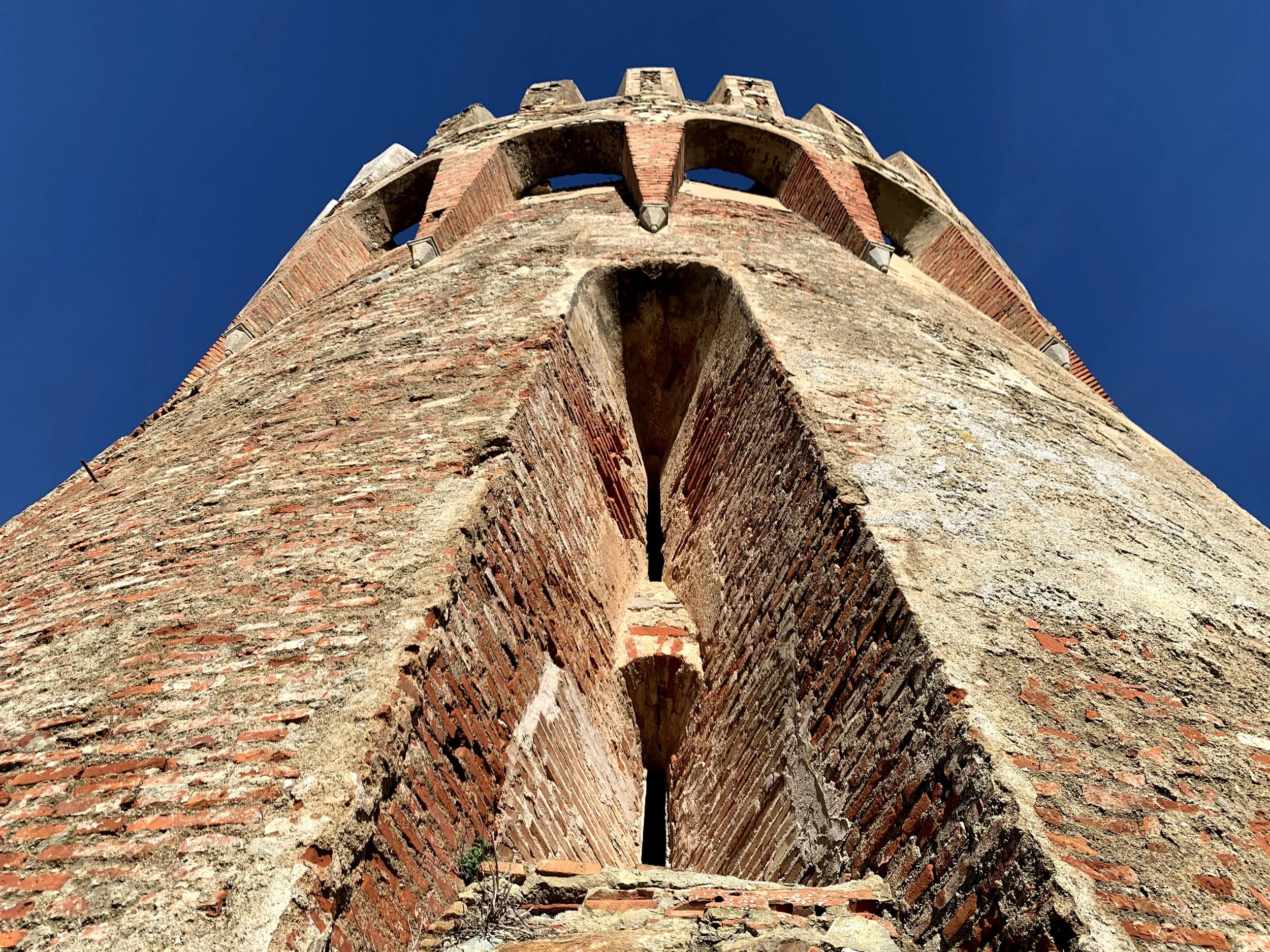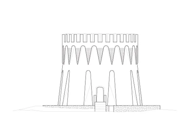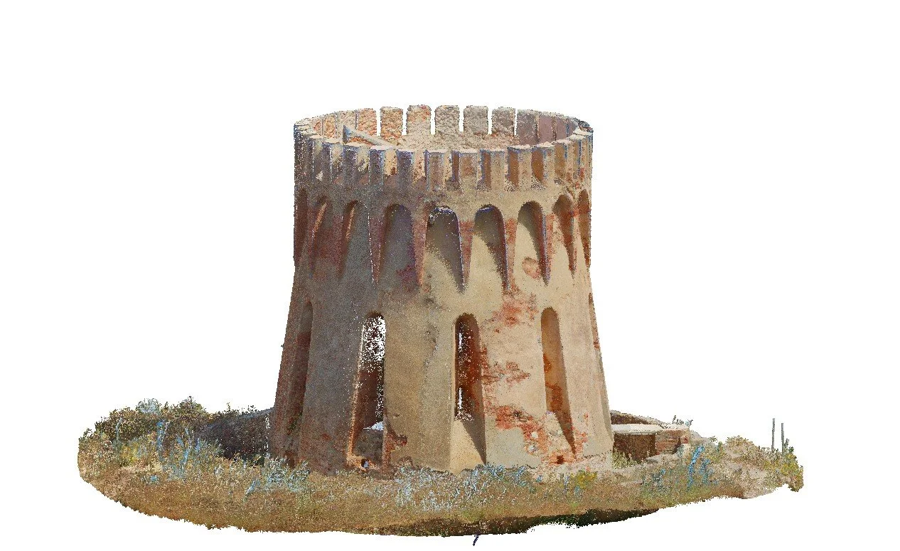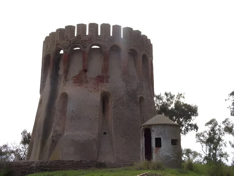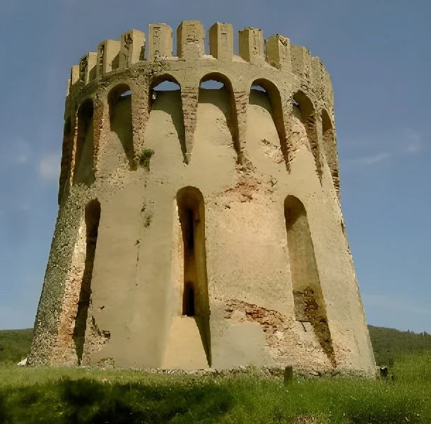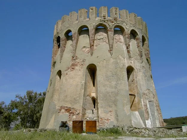 Torre defensiva troncocónica de planta circular desarrollada en planta sótano, baja, primera y cubierta. Muros, coronados por almenas en los que se abren troneras, arpilleras y matacanes. Dispone de foso seco perimetral, proporcionando su acceso al recinto mediante puente elaborado de losa de hormigón. construcción de la base con mampuesto de piedra y regularización de hiladas en ladrillo. Planta sótano con pozo. Planta baja exenta, sin distribución alguna, hueco de escalera que da acceso a sótano, y de obra a planta primera. Planta promera sin compartimentación, con gran escalera central de obra, que de acceso a cubierta. La cubierta con matacanes para el tiro.