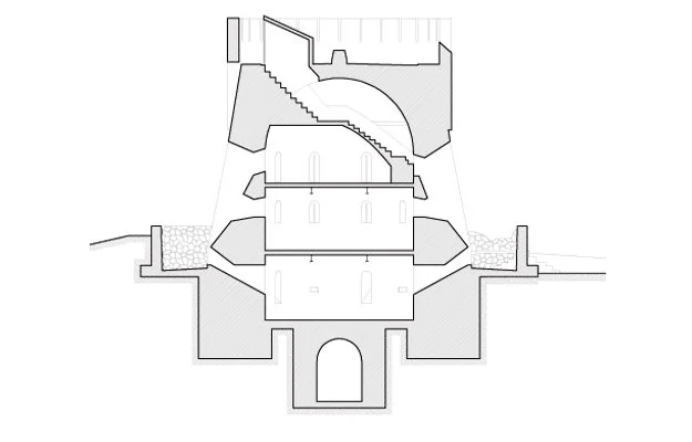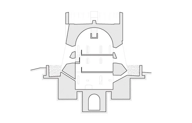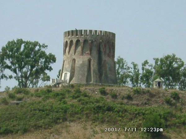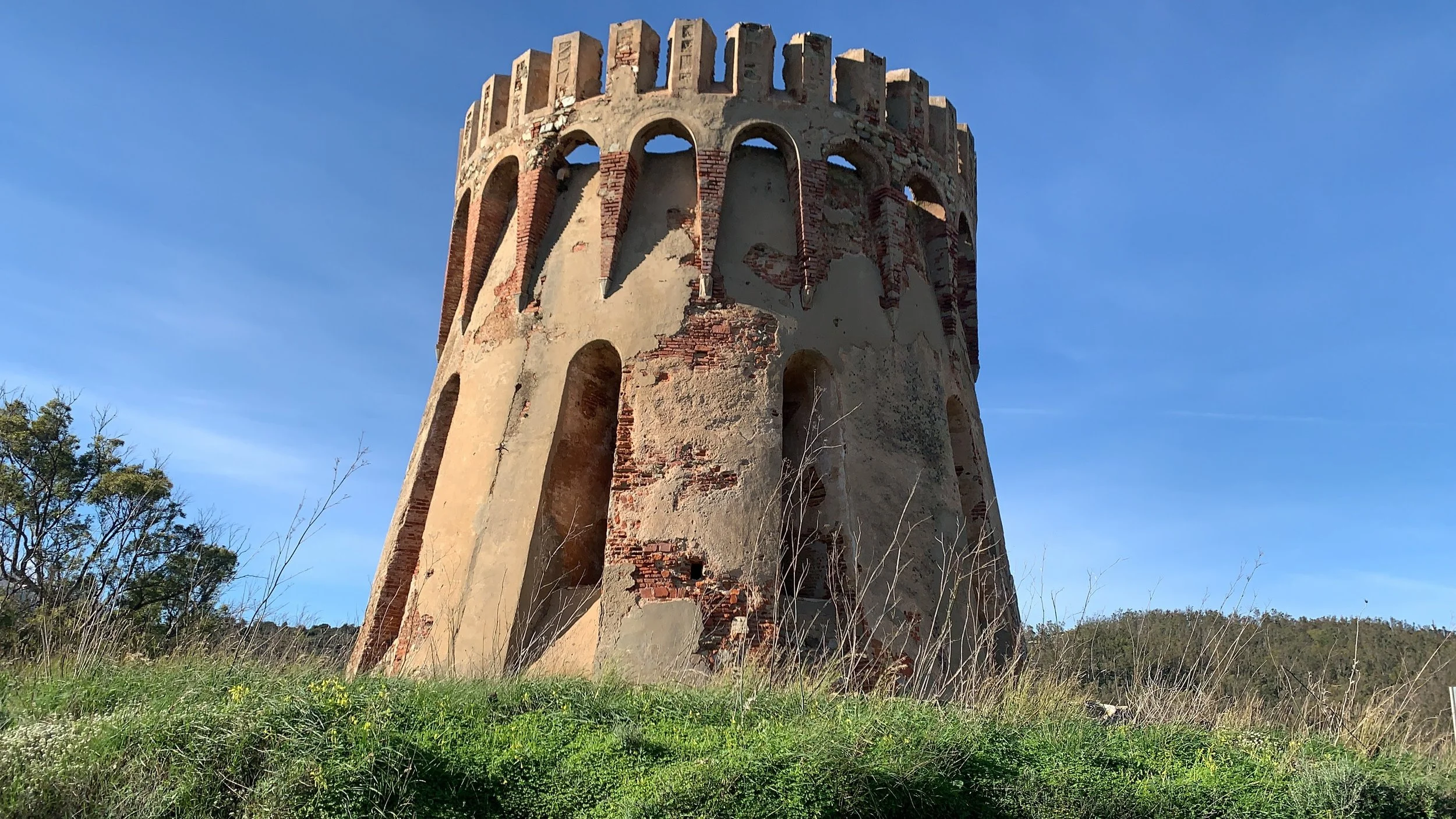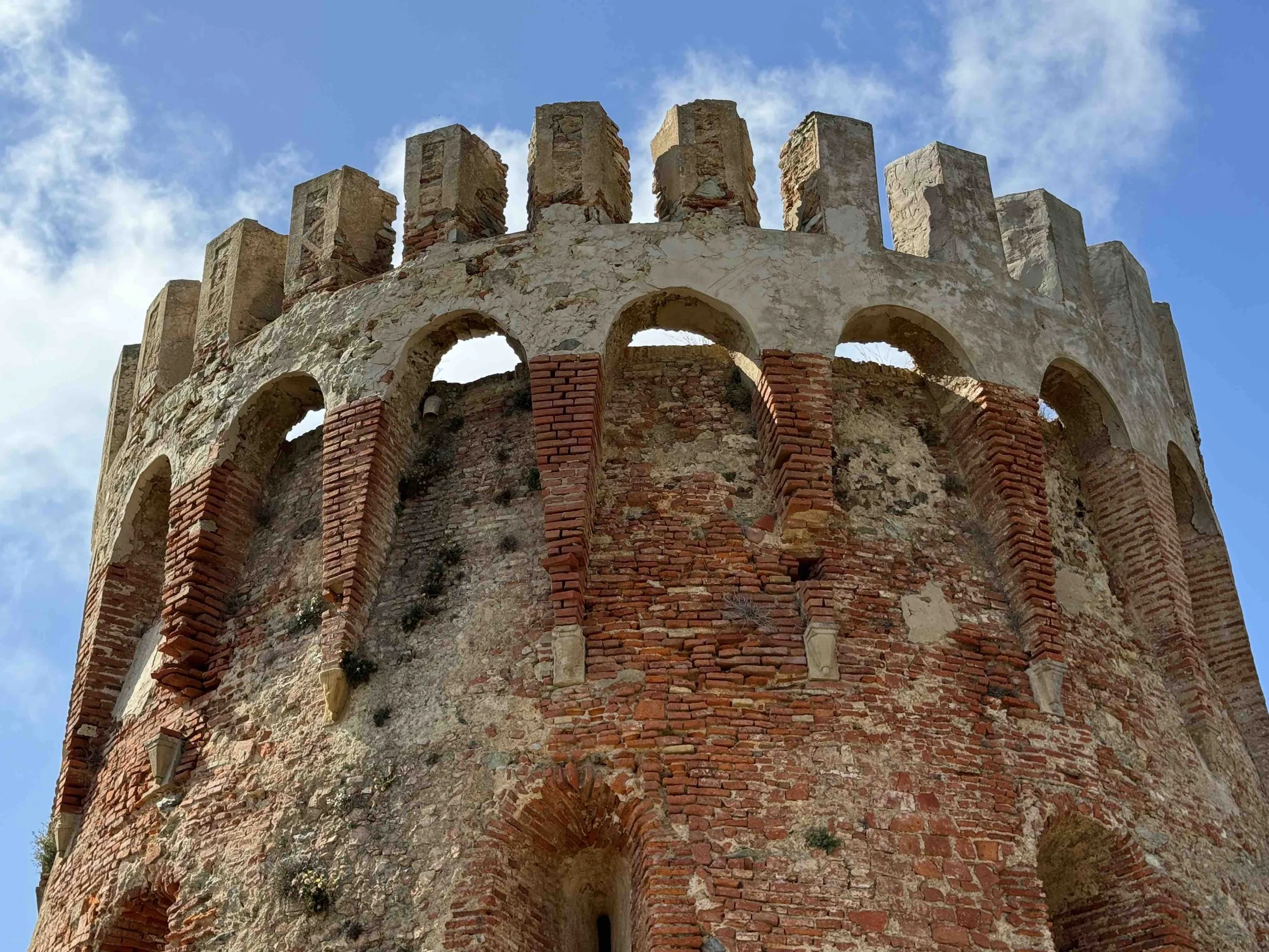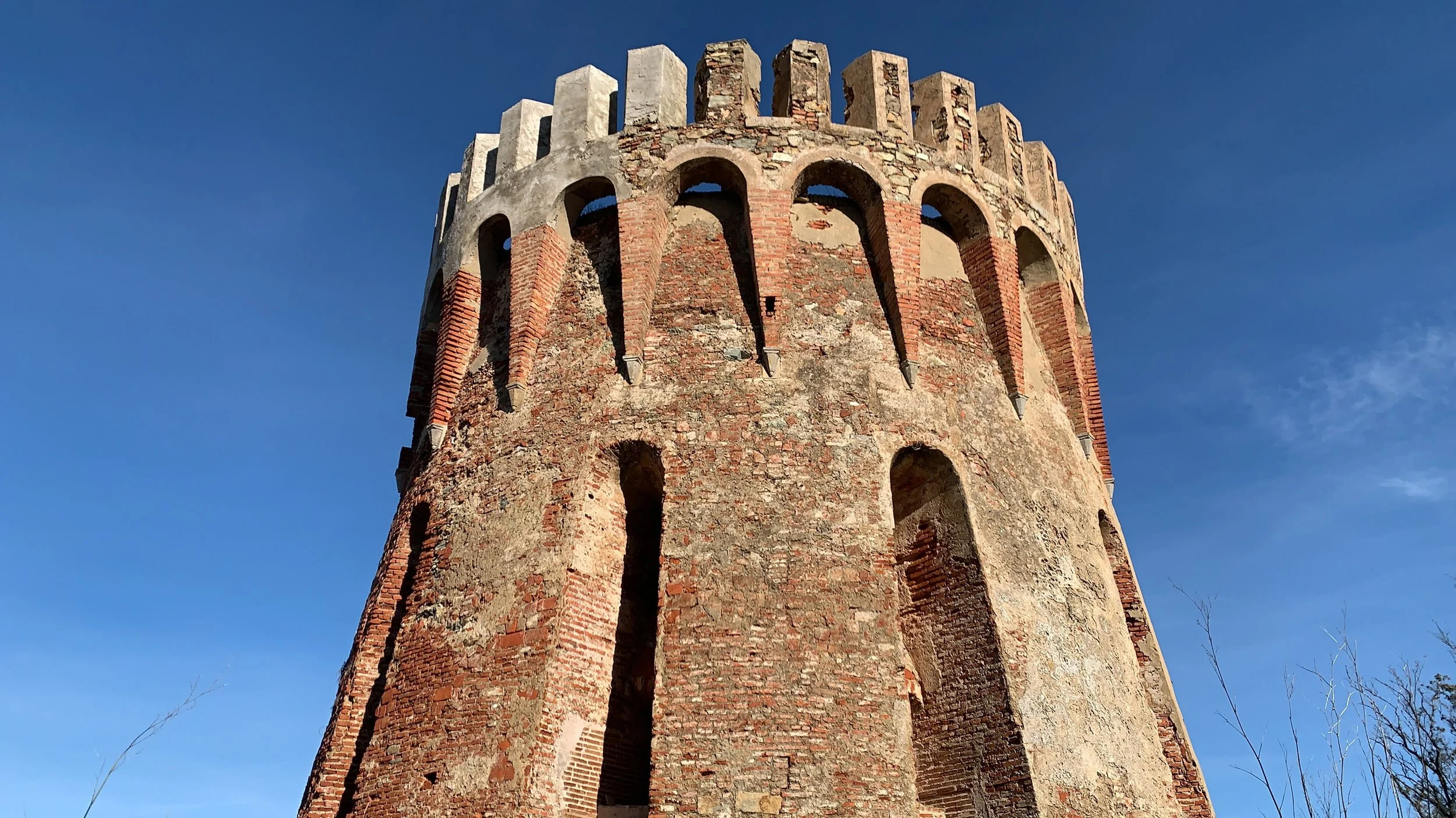 Torre defensiva troncocónica de planta circular desarrollada en planta sótano, baja, primera y cubierta. Muros, coronados por almenas en los que se abren troneras, arpilleras y matacanes. Dispone de foso seco perimetral, proporcionando su acceso al recinto mediante puente elaborado de losa de hormigón. construcción de la base con mampuesto de piedra y regularización de hiladas en ladrillo. Planta sótano con pozo. Planta baja exenta, sin distribución alguna, hueco de escalera que da acceso a sótano, y de obra a planta primera. Planta promera sin compartimentación, con gran escalera central de obra, que de acceso a cubierta. La cubierta con matacanes para el tiro.