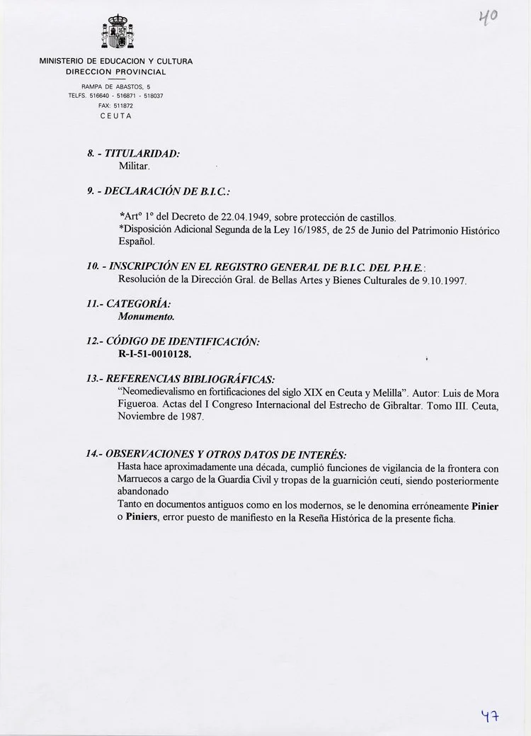 Parte de la información aquí expuesta ha sido extraída de la Diagnosis del estado de conservación de los bienes de interés cultural de Ceuta, por Ramón Queiro Quijada y José Francisco Montes de la Vega.