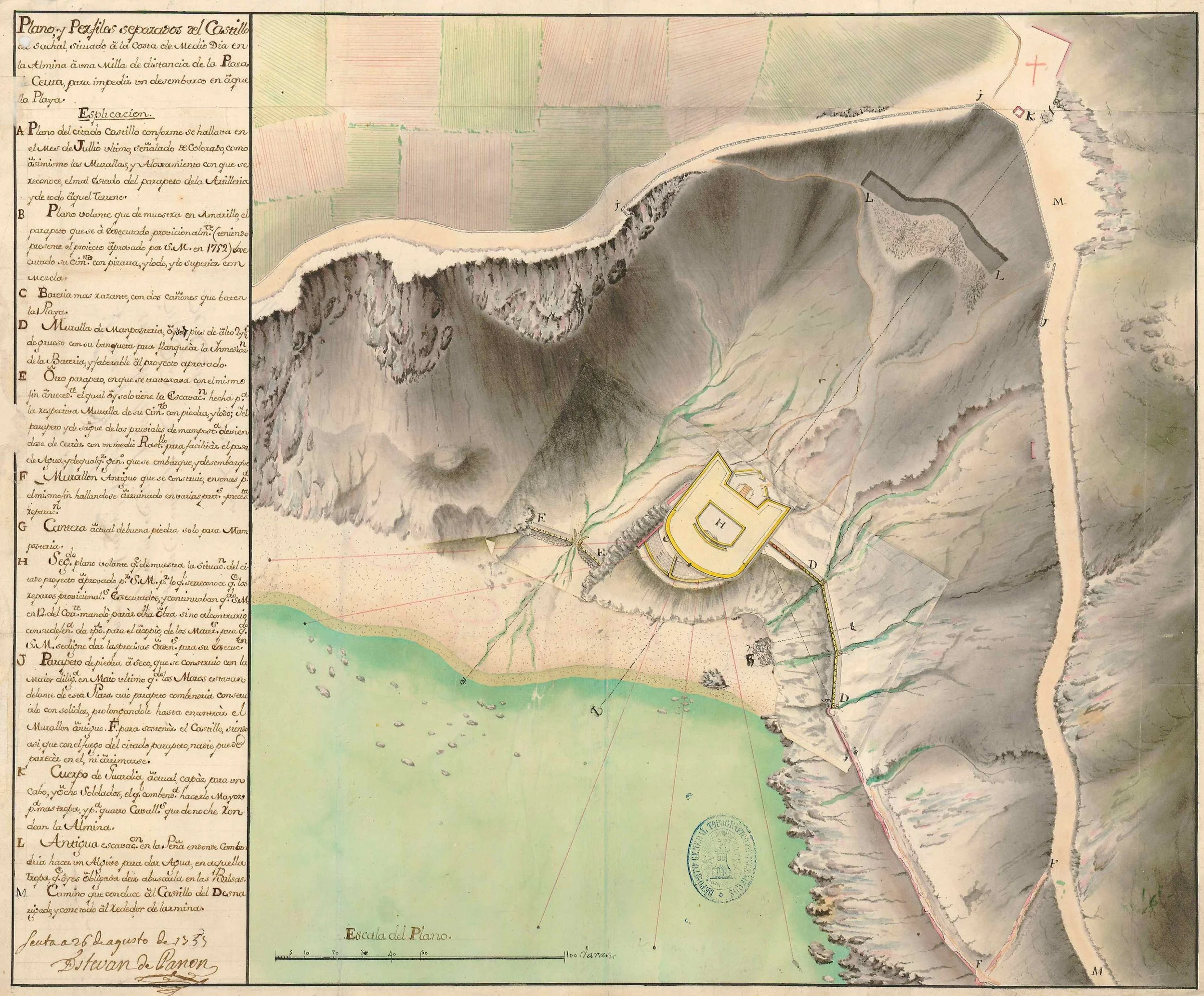 Ante este dato, disponemos de un muy temprano precedente ceutí para el modelo que se generaliza en el mediodía andaluz varias décadas más tarde. Se da el caso que la obra responde a un modelo muy próximo a otros dos estandarizados para la artillería costera que nace a mediados del siglo XVIII. Se trata de la serie que, a partir de las trazas de José Crame, se aplica en las costas de Andalucía Oriental a partir de 1765⁴. El despliegue del modelo creado por Crame ocupa, en su versión de fuerte grande para cuatro cañones, desde San José de Sabinillas, en el extremo occidental de la provincia de Málaga, hasta el Fuerte de Rodalquilar, en la costa almeriense⁵. En la versión de dos cañones, entre la Torre del Lance de las Cañas, en la costa de Marbella⁶, a la de Macenas, en Mojácar (Almería).