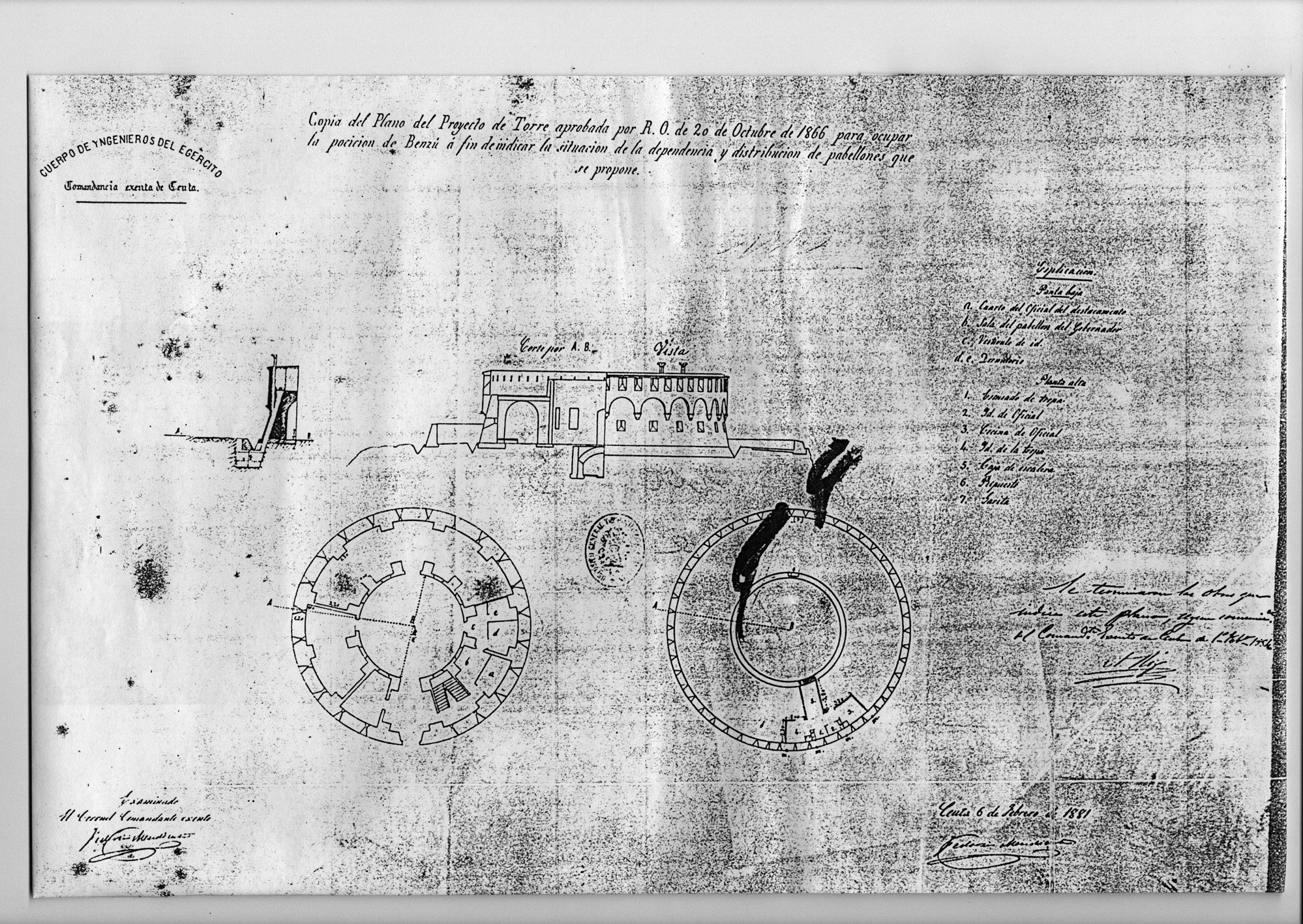 “Torre de Mendizábal. Por B.O. de 12 de septiembre de 1864 se da paso a la formación de Proyecto de esta Torre, que fue aprobado por R. O. de 20 de octubre de 1866… terminándose las obras en 1881-82”. (informe de la gerencia de infraestructura del Ministerio de Defensa).
