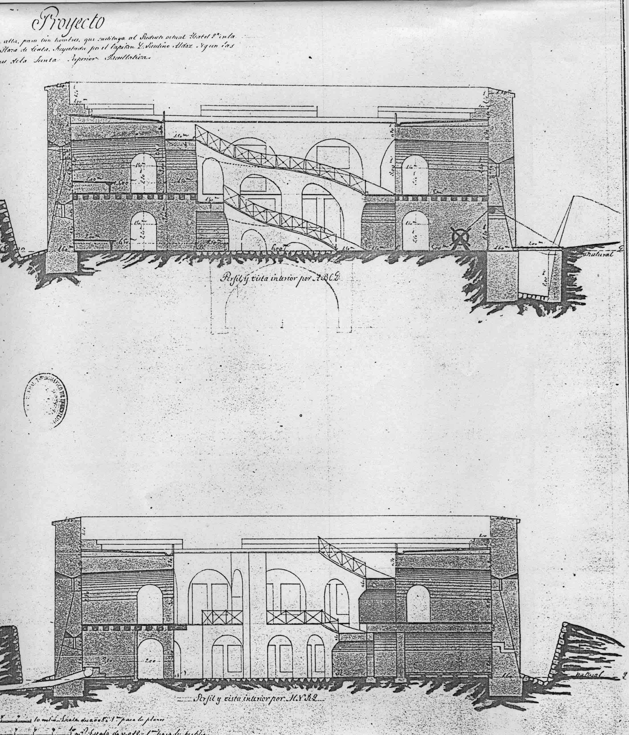 El primer proyecto data del 25 de octubre de 1860 por D. Paulino Aldaz (figura xx). Se trataba de una torre de planta octogonal, patio central, dos alturas con galerías aspilleradas y cubierta coronada por merlones. Todo el fuerte estaría rodeado por un foso seco. En el interior se alojaría un aljibe para recoger y almacenar las agua pluviales.