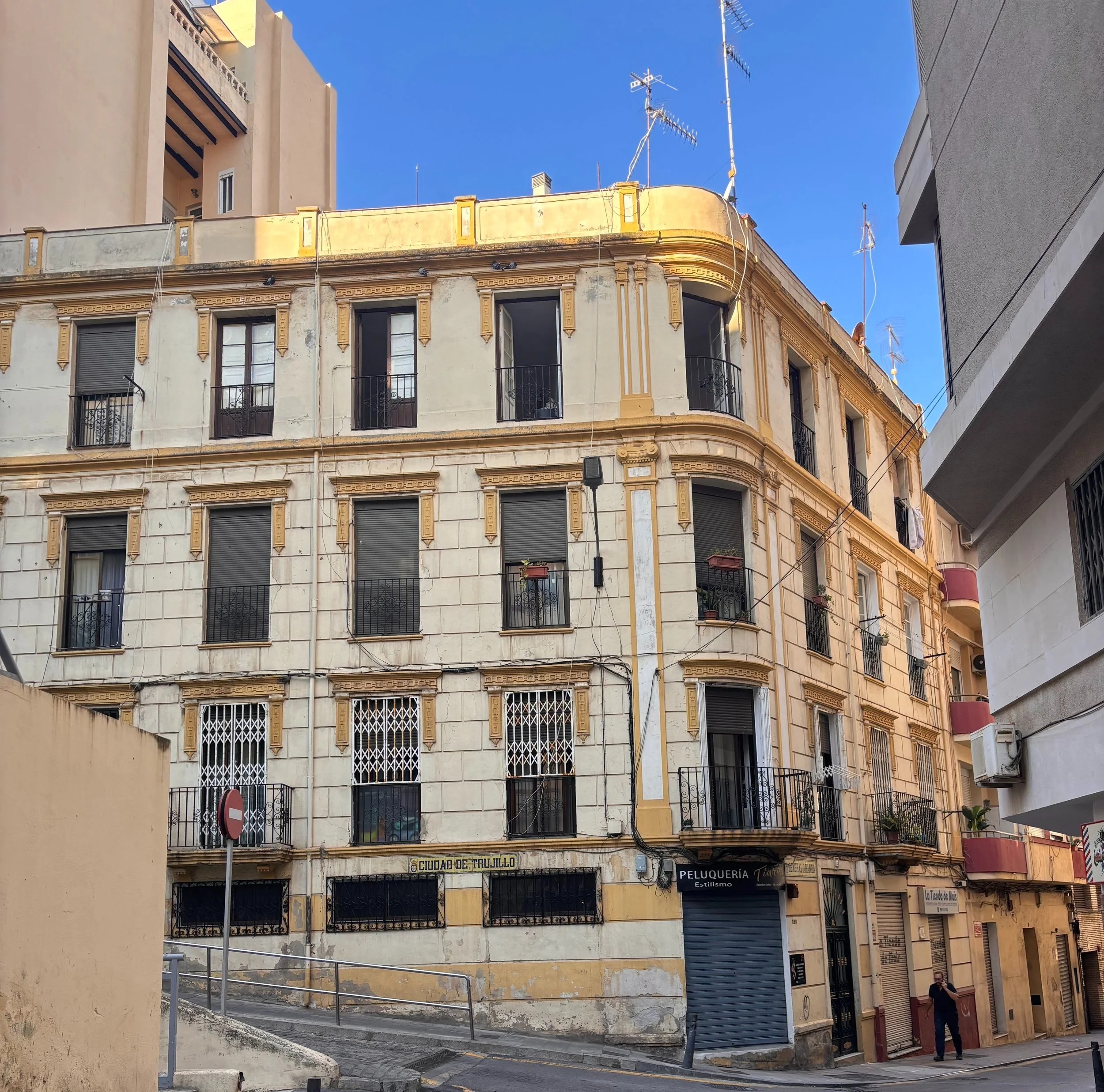 Estructura: Edificio en esquina entre medianeras de cuatro plantas formando manzana