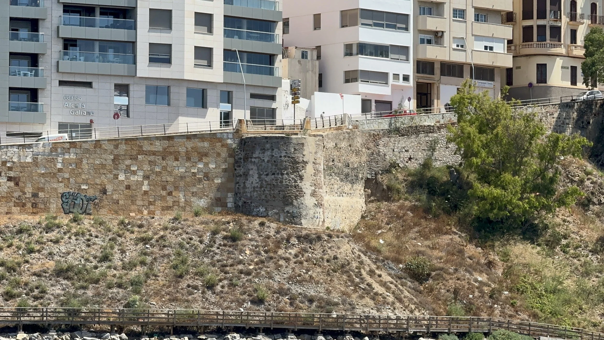 El trazado de las obras de fortificación sigue la línea de la cima del cortado, adaptándose al escarpe, de ahí que presenten un replanteo irregular. A su pie existe un importante talud de tierra natural que cae a pico hasta la playa rocosa. Sobre los muros defensivos, rompiéndolos a veces, se desarrollan la acera peatonal y algunos muros de contención, que siguen el curso de la Calle Recinto Sur. El acerado es estrecho y se protege al exterior por un parapeto de fábrica pintado. No existen zonas de aparcamiento ni posibilidades de acceso rodado ni peatonal hasta los vestigios arqueológicos. De este modo, estas fortificaciones se configuran a modo de límite o frontera entre ambos ámbitos, el de la vía rodada y el acantilado, quedando definidos como muros de contención de tierras en muchos casos.