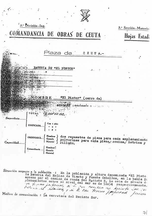 El urbanismo de la Almina en esta zona está caracterizado por la presencia de una gran manzana de propiedad y uso militar, con 13.800 m2 registrados, abarcando toda la coronación de las alturas de San Simón. Antes se ubicaban allí las baterías del Pintor y del Molino, obras del siglo XX que no se deben confundir con las anteriores, objeto de este PE. En la actualidad acoge servicios de inteligencia militar.