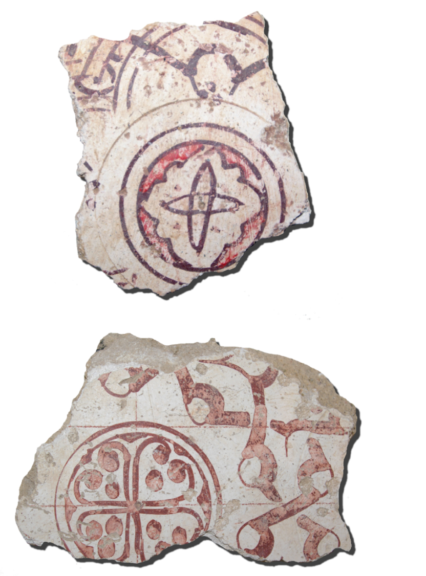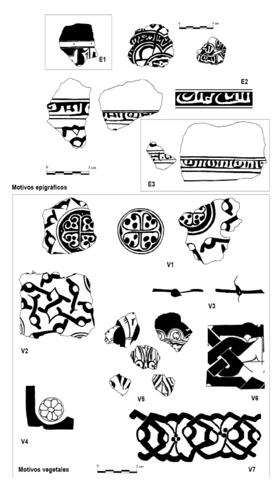 También, muy distintos, son los fragmentos recuperados en el Mirador I, que combinan amplias superficies pintadas en rojo con motivos posiblemente vegetales (V6), algo que recuerda a zócalos del periodo almohade o, incluso, anteriores.
