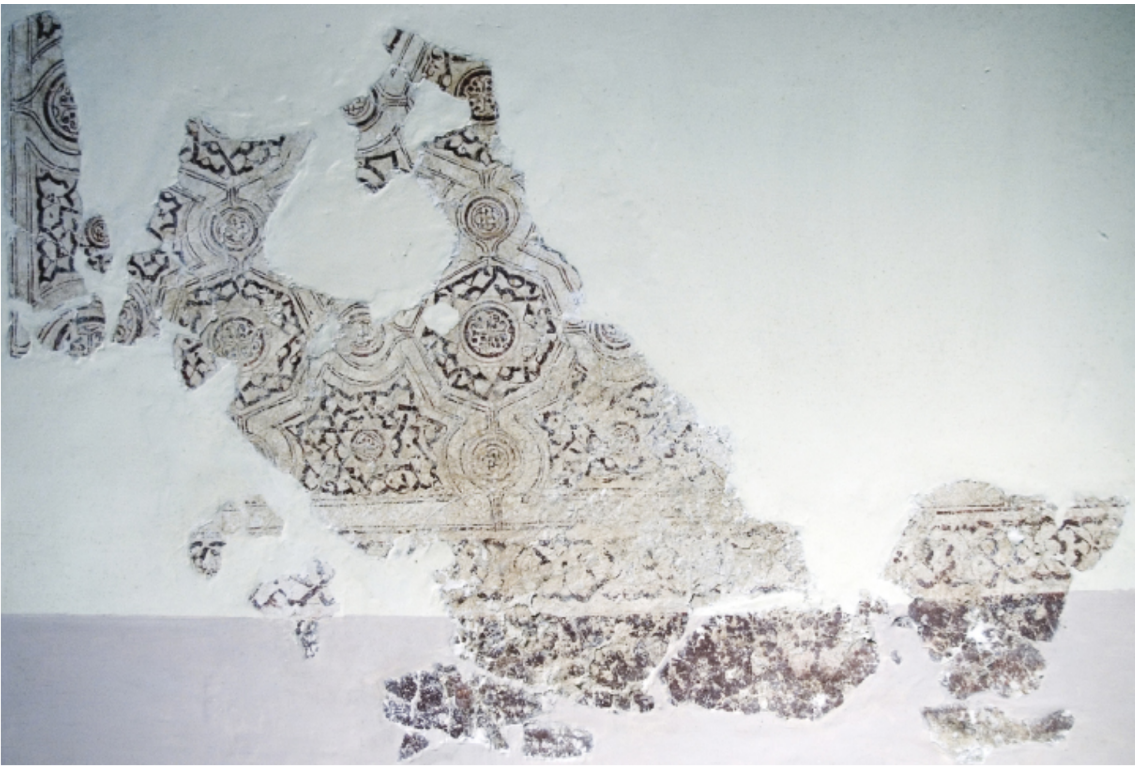 El espacio entre los motivos octogonales únicamente se ha conservado en la parte inferior de la composición. Allí es resuelto con estrellas de ocho puntas rellenas también por tallos vegetales (V2) que dibujan estrellas, esta vez de seis puntas. En el centro presentan el mismo motivo con nudo inserto en un círculo aunque de tamaño más reducido. Es posible que esta solución sea específica de los bordes de la decoración mientras que en el resto del panel pudieron pintarse otros motivos de los que apenas quedan restos. Algún trazo conservado apunta la presencia de medallones.