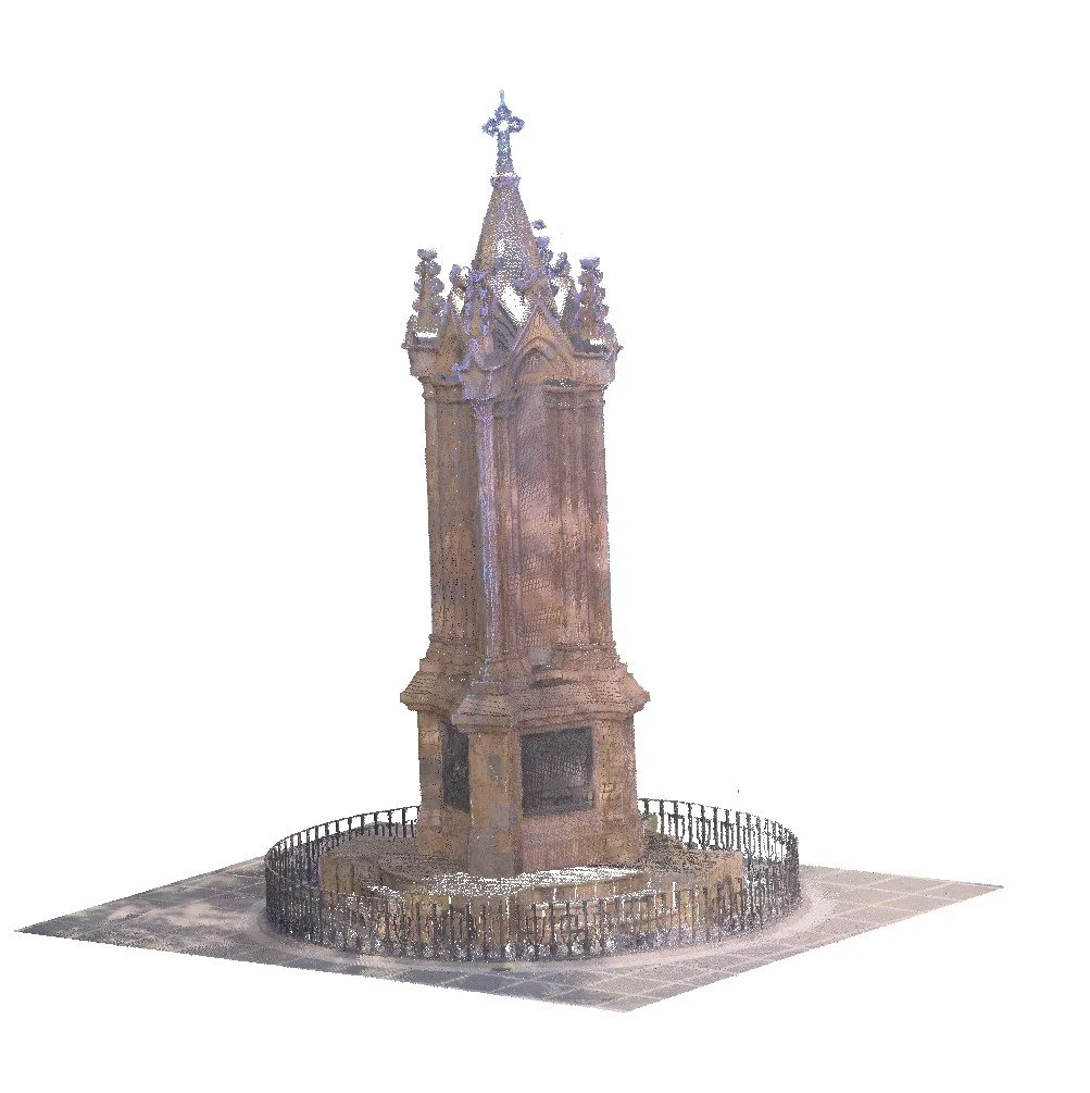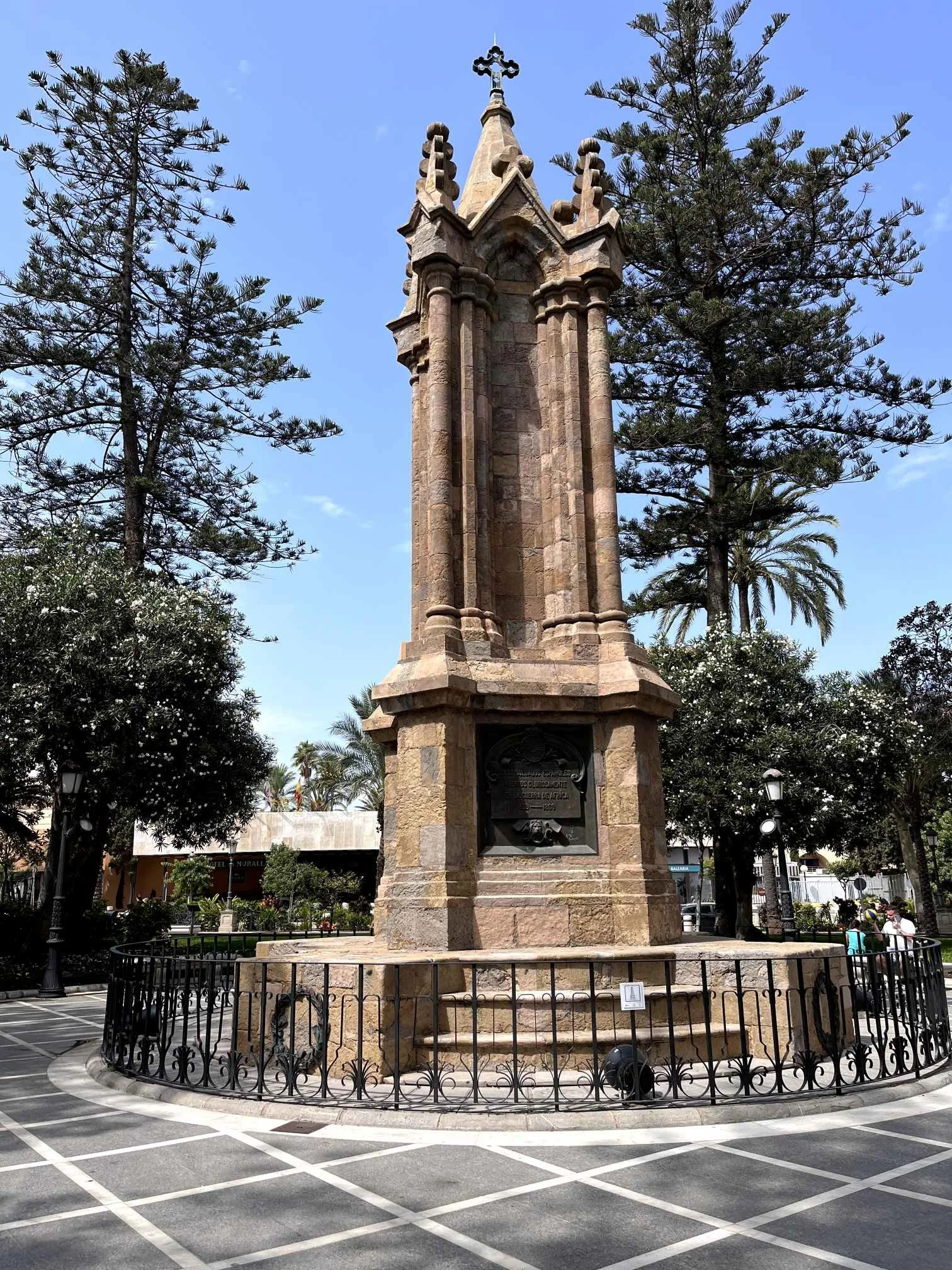 Composición: Monumento sobre pedestal en forma de baldaquino neogótico con columnillas enmarcando arcos ojivales coronados por cruces de piedra, rematado el conjunto con una aguja.