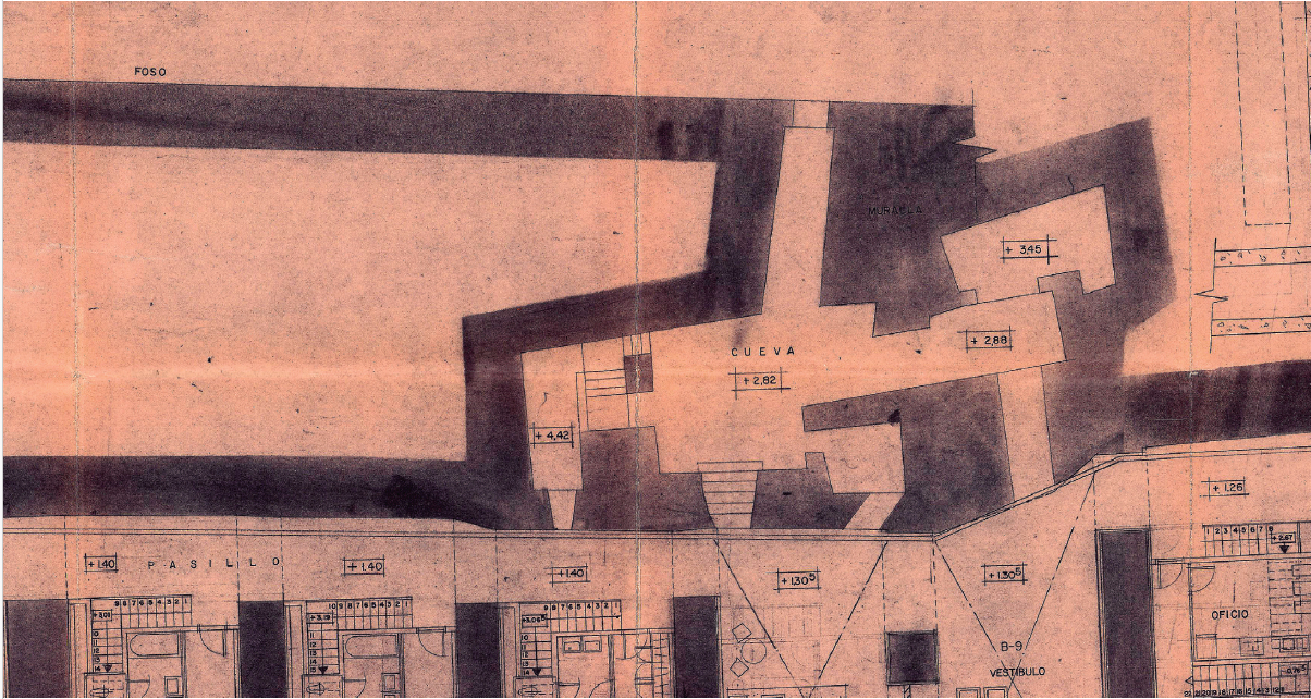 Del mismo modo, se dibuja lo que llaman “Cueva” con todos sus espacios, incluida la pequeña oquedad a la que daba acceso el arco de la hoy denominada Puerta Califal, entonces solo a la vista en su parte superior.