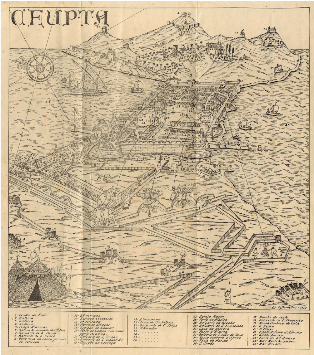 Desde niño, recuerdo que era frecuente que alguien comentara aquella vista, explicara qué se veía y qué no se veía, así como que todos hacían cábalas sobre qué indicaba tal o cual número, que Dornellas no había podido completar. Años de estudio de las escrituras de la Santa y Real Casa de la Misericordia, que forman uno de los fondos estrella del Archivo General de Ceuta, me llevaron en 1990 a presentar al II Congreso Internacional El Estrecho de Gibraltar (Gómez, 1995), un trabajo con una mirada nueva sobre lo que se veía en aquella vista. Por vez primera, el objetivo no estaba detrás de la plaza de África, sino que también se ponía en el espacio que iba desde ese lugar de reunión a la Muralla Real, descubriendo dos barrios: El del Castillo, es decir, la reutilización de la alcazaba meriní, que iba bastante más allá de un palacio para los gobernadores, como ya dejaba claro Carlos Posac Mon en La última década lusitana de Ceuta (Posac, 1969); y el de la Cerca, un barrio levantado con una serie de construcciones similares y en paralelo, con varias calles, que ocupaban un espacio que en época medieval debió ser la verdadera plaza de acceso a la Mezquita Aljama. Siempre me he preguntado, y sigo haciéndolo, si todavía estamos a tiempo de encontrar en esa zona los grandes aljibes de los que hablan las fuentes, y que aún no han aparecido. Son interrogantes que continúan en la cabeza de muchos, pero que no llegan al papel casi nunca, como ¿Dónde fueron a parar las columnas de mármol de la Mezquita Aljama, cuando ésta fue derribada a finales del siglo XVIII? ¿Se enterraron? ¿Se vendieron? ¿Cómo es posible que no quedara ninguna en la ciudad?