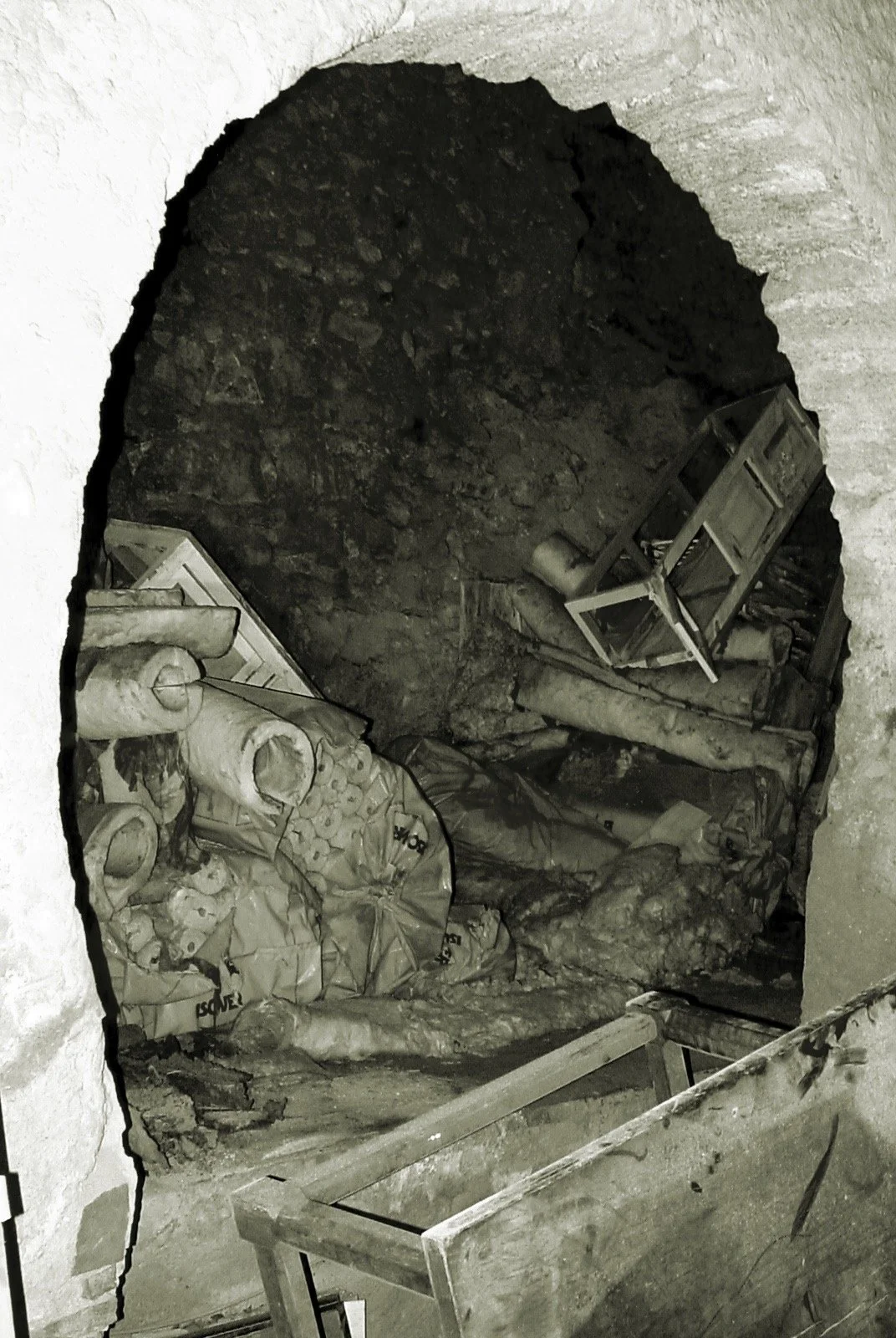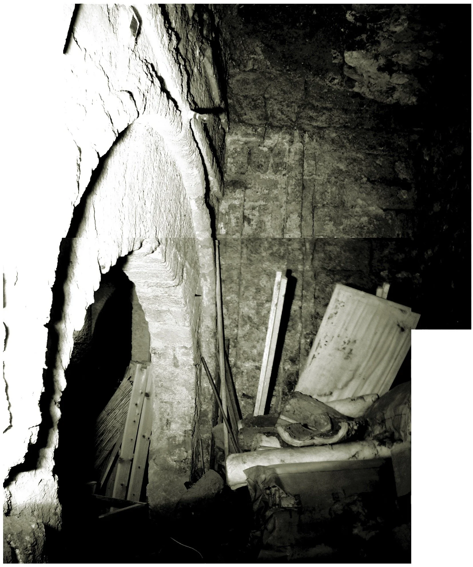 Al encontrarme con una linterna entre mis manos y puesto que todo el mundo había salido ya al jardín para dirigirse hacia la cubierta, le dije a José Pedro que si aquí había un lienzo de muralla califal, sería lógico que continuara hacia el otro baluarte y que por tanto apareciera en la estancia que habíamos visitado anteriormente; había que volver a la cúpula. Le dije a Antonio que si podía abrirnos otra vez el “trastero” porque queríamos comprobar algunas cosas con la linterna y nos dijo que no había ningún problema. Nos siguieron José María Hernández y José Manuel Hita y una vez en el interior, me dediqué a explorar las estancias asociadas y que estaban totalmente a oscuras. Empecé por la primera que estaba a la derecha, pero sus dimensiones (a pesar de su altura) no me llamaron excesivamente la atención. A continuación me dirigí a otro espacio contiguo que seguía manteniendo el mismo revestimiento de cemento pero cuya altura disminuía, coronada por una bóveda de aristas. Me fijé en el arco de medio punto que había en un lateral y en el espacio que había tras él, completamente oscuro, lleno de objetos y materiales de construcción. Era una especie de local residual cuya cota interior era un metro y medio más alta, lo que dificultaba el acceso.