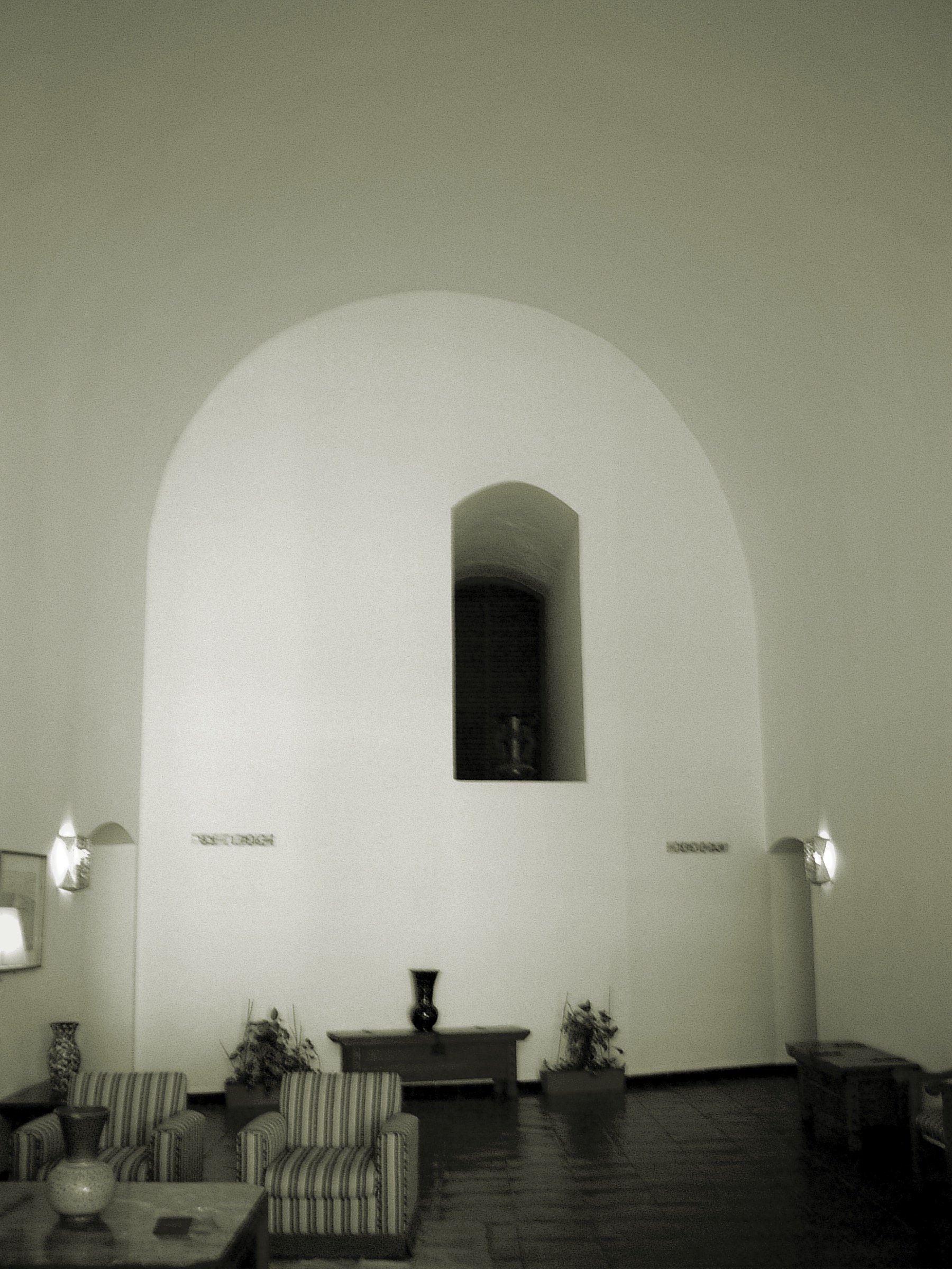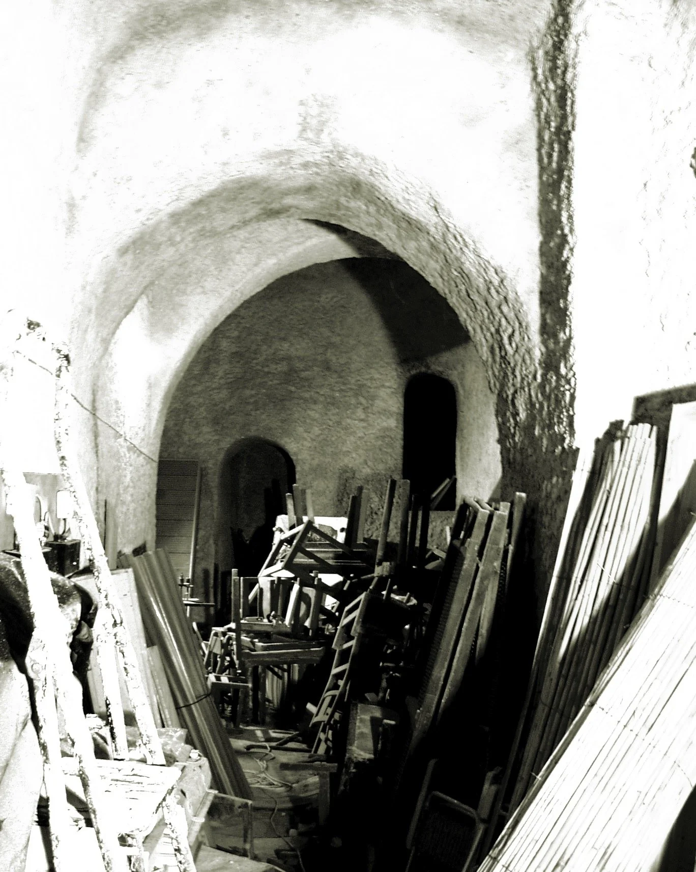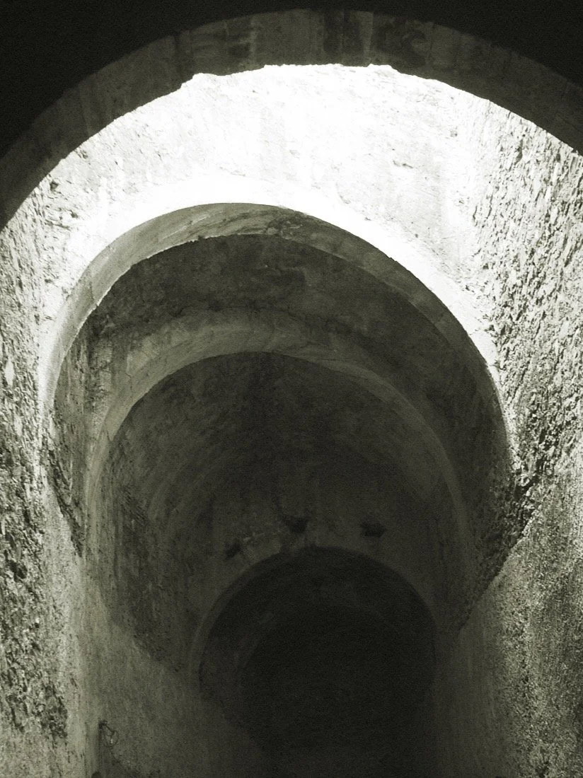 Al día siguiente Adolfo me esperaba en el vestíbulo del Parador e instantes después se nos acercó el director, tras atravesar la galería comercial y cruzar el jardín, llegamos a la puerta que daba acceso a las habitaciones de las bóvedas del antiguo Parque de Artillería. Hacía tiempo que no entraba allí pero la bóveda me impresionó como si fuera la primera vez que la visitaba, una bóveda que es la única que mantiene su volumen original (aparte de las de la discoteca), al no haberse construido una planta intermedia como en las demás.