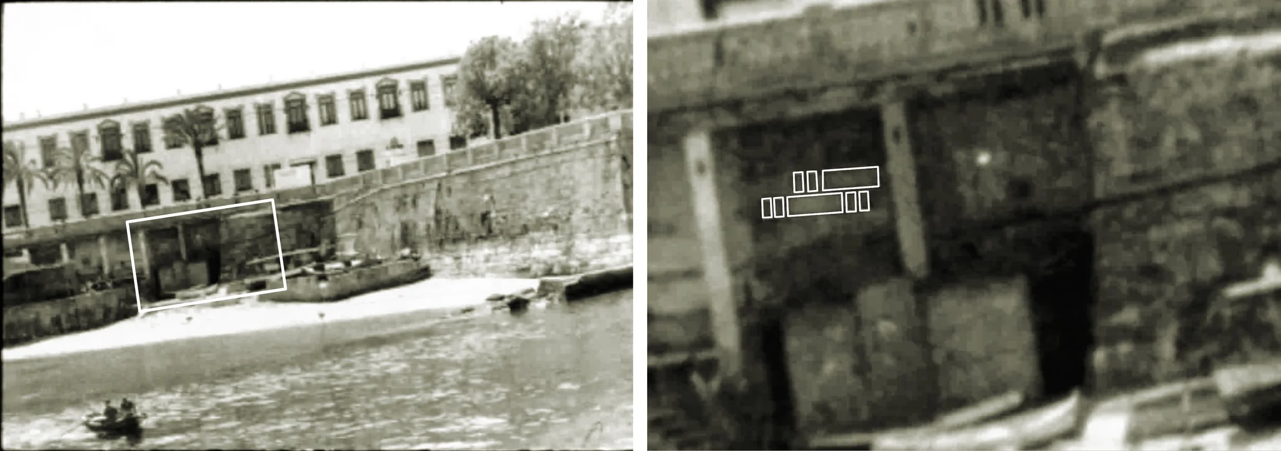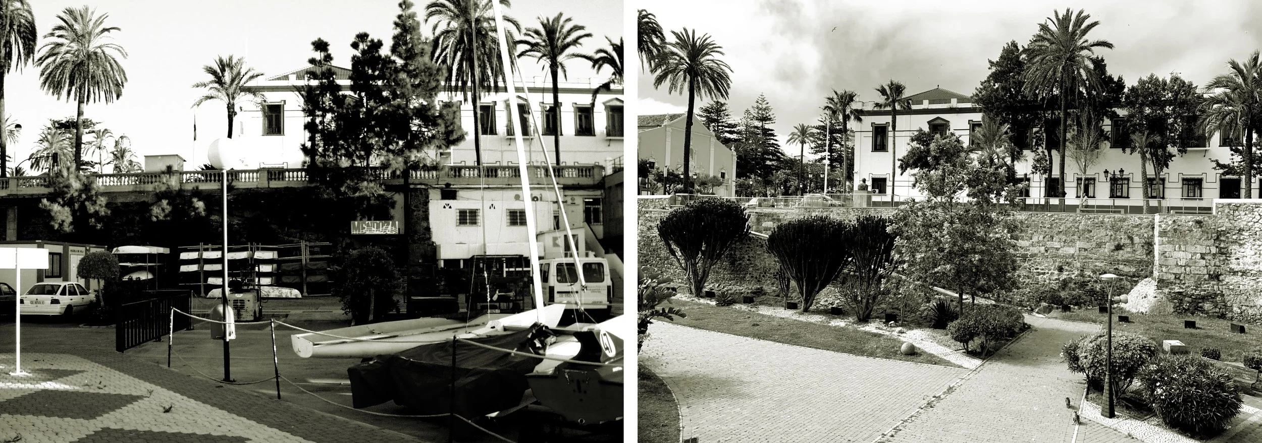 Esta metodología o, mejor dicho, actitud también la apliqué a los proyectos en los que trabajaba en Ceuta justo antes del descubrimiento y en los que de una manera u otra, esos mismos amigos participaban conmigo descifrando el patrimonio, intentando entender mejor la historia de la ciudad. Además de los fuertes neomedievales, ya reseñados, estaban los tres morabitos de la ciudad (Sidi Brahim, Sidi Embarek y Sidi Bel Abbas as-Sabti), las obras del Desdoblamiento del Paseo de las Palmeras, la colaboración con Fernando Menis para el paseo peatonal en el monte Hacho (desde San Amaro hasta Santa Catalina), la reutilización del Almacén de Abastos para las conferencias y exposiciones del Colegio Oficial de Arquitectos... En todos esos proyectos el patrimonio abarcaba desde la época califal hasta la actual por lo que era necesario una aproximación a la historia de la ciudad global, y no exclusivamente por épocas o áreas. El caso más claro fue el proyecto del Desdoblamiento del Paseo de las Palmeras, cuyas obras se iniciaron en marzo de 2002 (tres meses antes del descubrimiento), con un lienzo de muralla compuesto por elementos que iban del siglo X al XX. Sabíamos, porque era visible, que había una torre omeya en el interior de las oficinas del Real Club Náutico CAS, pero tras el descubrimiento en el interior de las Murallas Reales, pensamos que quizás podrían aparecer otros restos de la misma época; ese fue uno de los objetivos de las excavaciones arqueológicas que iba a desarrollar Fernando Villada y que al final no dieron el resultado deseado, sin embargo en julio de 2003, revisando toda la planimetría y las fotografías antiguas aportadas por José Luis Gómez Barceló en la Memoria Histórica del proyecto, en una de las fotos hechas por Juan Bravo, tras ampliarla en el ordenador, observé cómo había un aparejo que parecía de soga y doble tizón en el lienzo contiguo a la torre y que estaba oculto por una construcción anexa al edifico principal. Una vez demolido el CAS a finales del 2003 quedaron al descubierto la torre ya conocida, un lienzo (bastante alterado) y una torre que formaba parte de la puerta de Santa María del siglo XV.