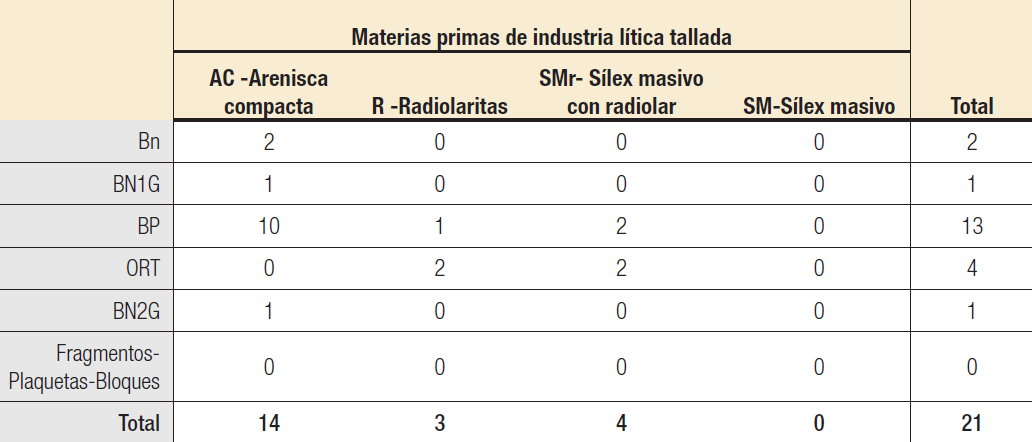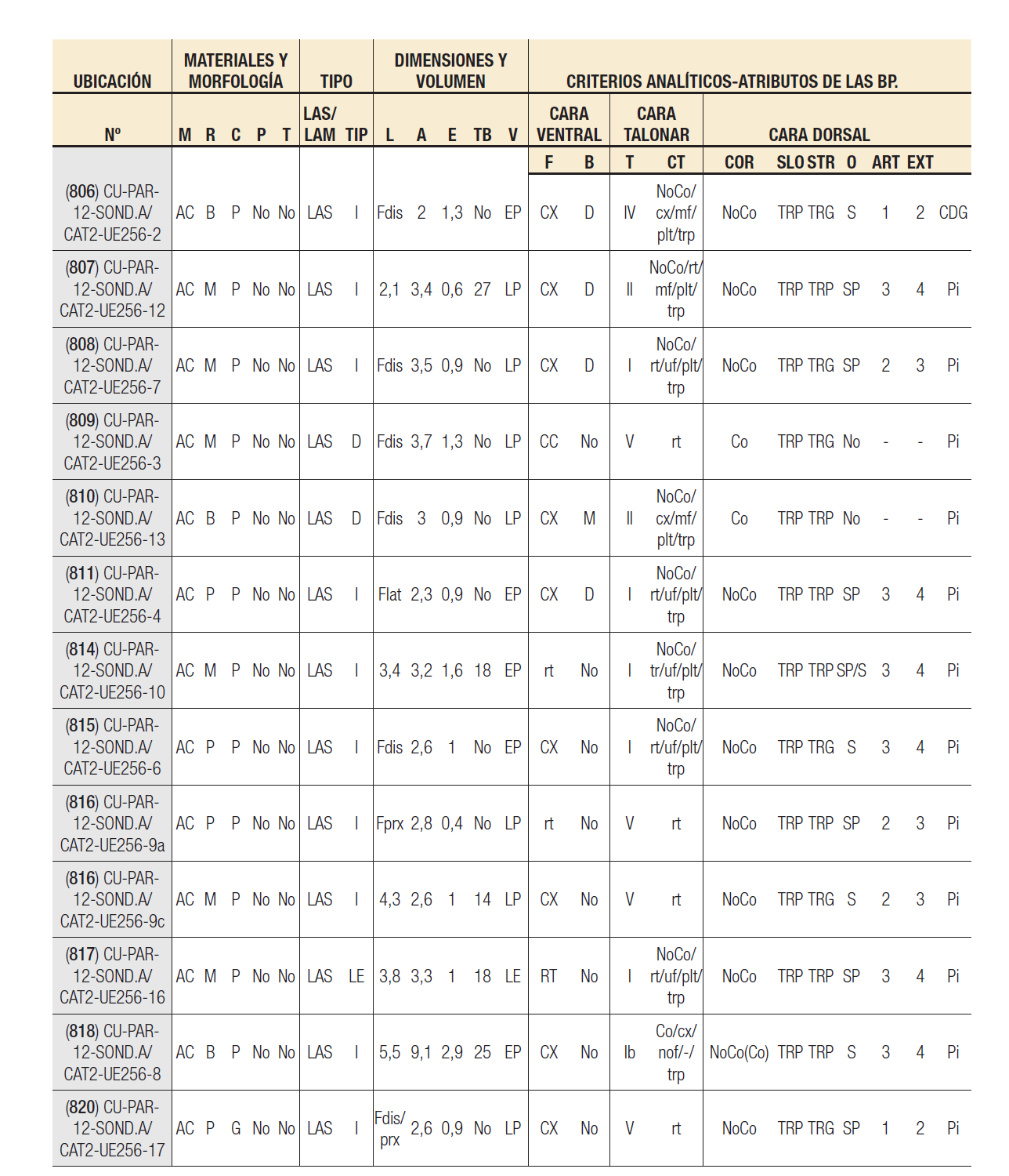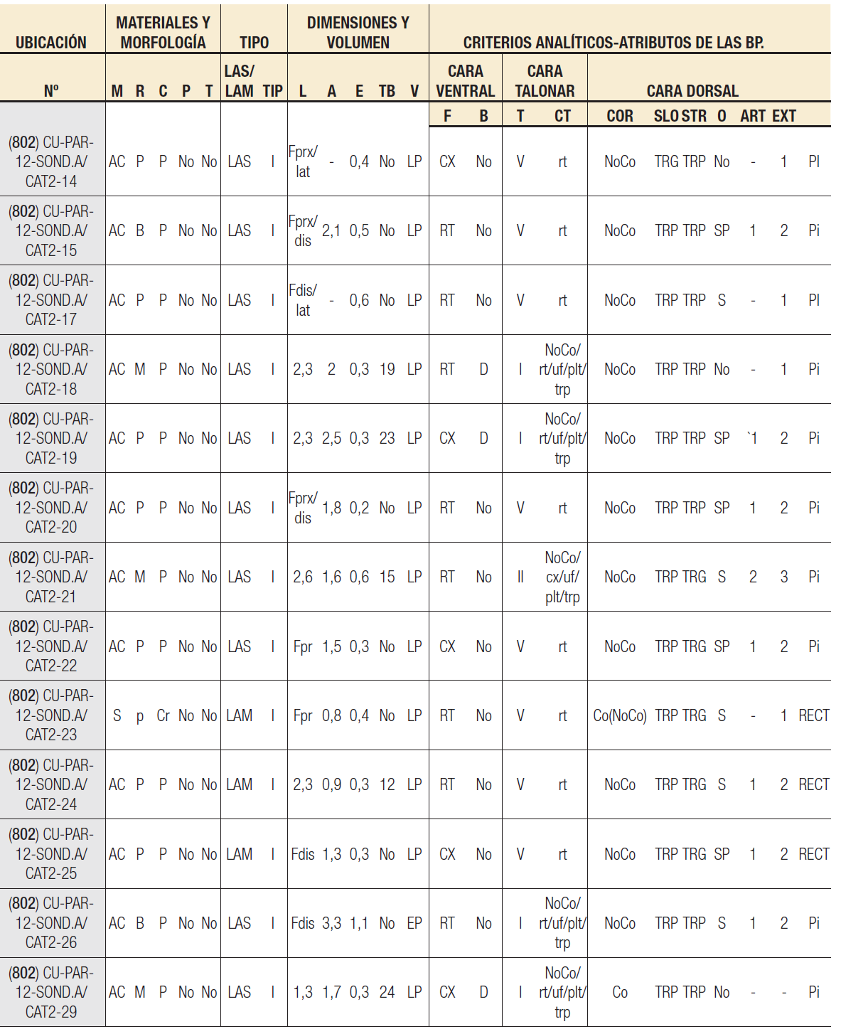 La descripción completa de este material lítico se puede encontrar en las Tablas 7, 12, 13 y 14.