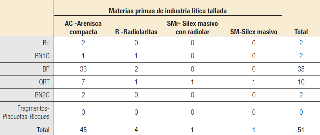 Se han documentado en total 25 ejemplares, pertenecientes a 18 ORT-E-Esquirlas y a 7 ORT-DES-Desechos. En Tabla 13 presentamos sus características, materias primas y morfología. Predominan las realizadas en AC-Arenisca compacta frente a las que son de S-Sílex. En cuanto al rodamiento, también hay una mayor presencia de las P-Poco rodadas, con 22 ejemplares, frente a las M- Medio rodadas, con 3 ejemplares. Son de color pardo en 15 ejemplares, gris en 5, crema en 3 y se ha documentado 1 ejemplar de color negro y 1 blanco. La mayoría, 21 ejemplares sin pátina y 4 tienen pátina blanca. Sólo 1 ejemplar presenta cúpulas térmicas producto de haber sido termo alterada por el fuego. La poca presencia de estos productos habituales en lugares de producción y talla lítica puede haber sido debida a la no utilización de criba del sedimento en esta excavación.