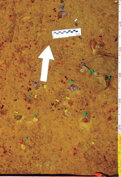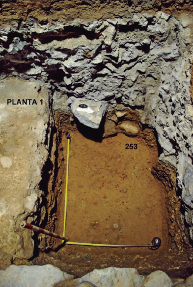 “Sobre el manto geológico descrito se detecta una serie de estratos, las UUEE 253, 254, 255 y 256, que desde el punto de vista deposicional y compositivo pertenecen a la secuencia de la Fase 0, pero presentan incluido en sus matrices un conjunto homogéneo de industria lítica tallada”.