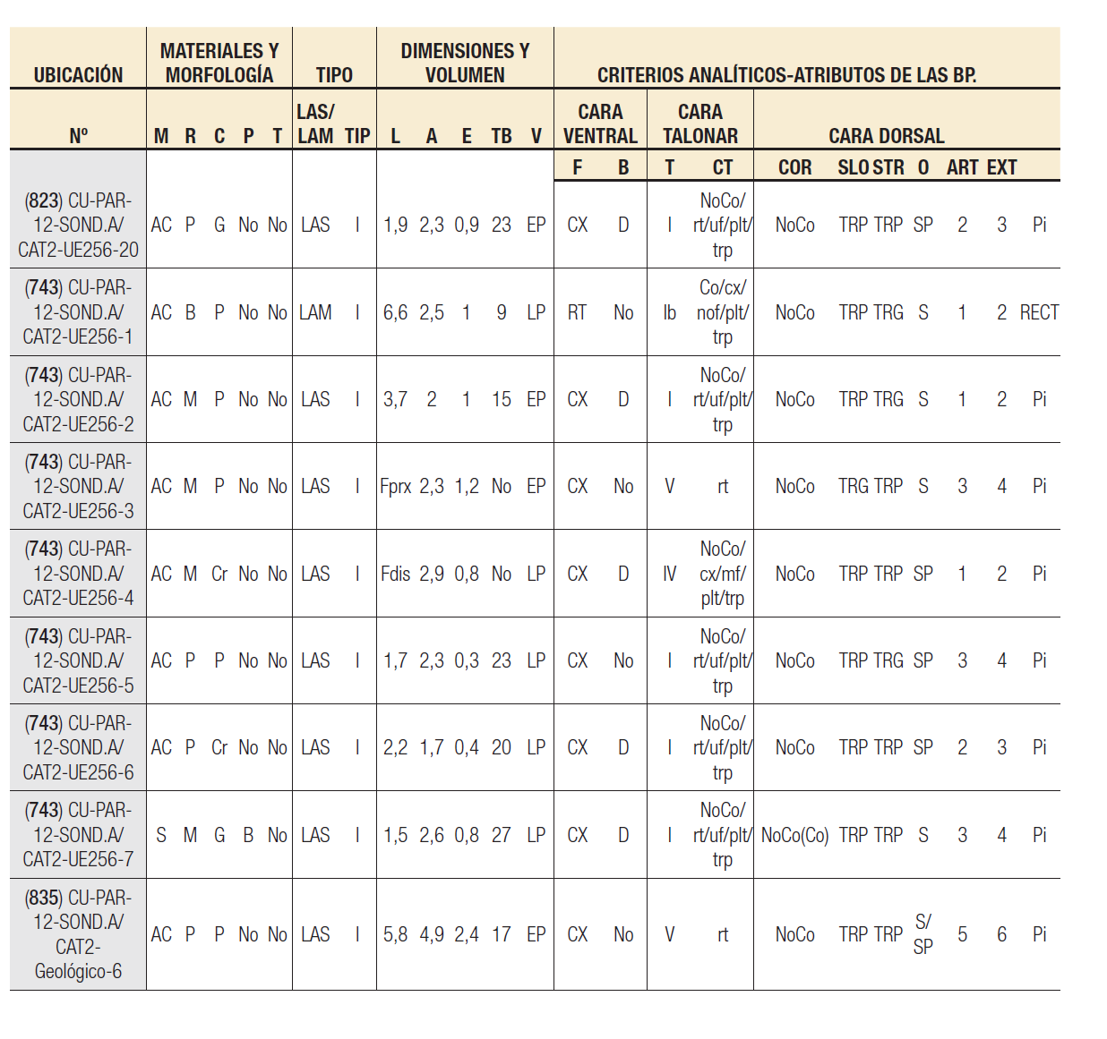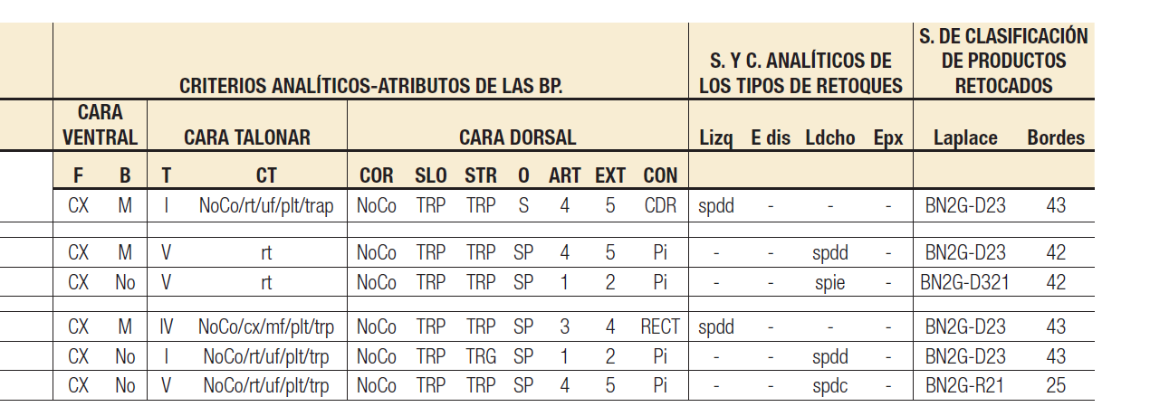 La compilación de datos y el estudio de las BP-Lascas y/o láminas, lo hemos conformado según el S.L.A. (Tabla 2). De este modo se presentan los datos vinculados con materias primas, rodamiento, color, pátina, carácter termoalterado, tipos de lascas y/o láminas, presentación de sus dimensiones, tipos según criterios de Bagolini (Bagolini, 1968) y volumen. Se presentan además los criterios analíticos relacionados con la cara ventral, con la cara talonar con la cara dorsal y con el contorno.