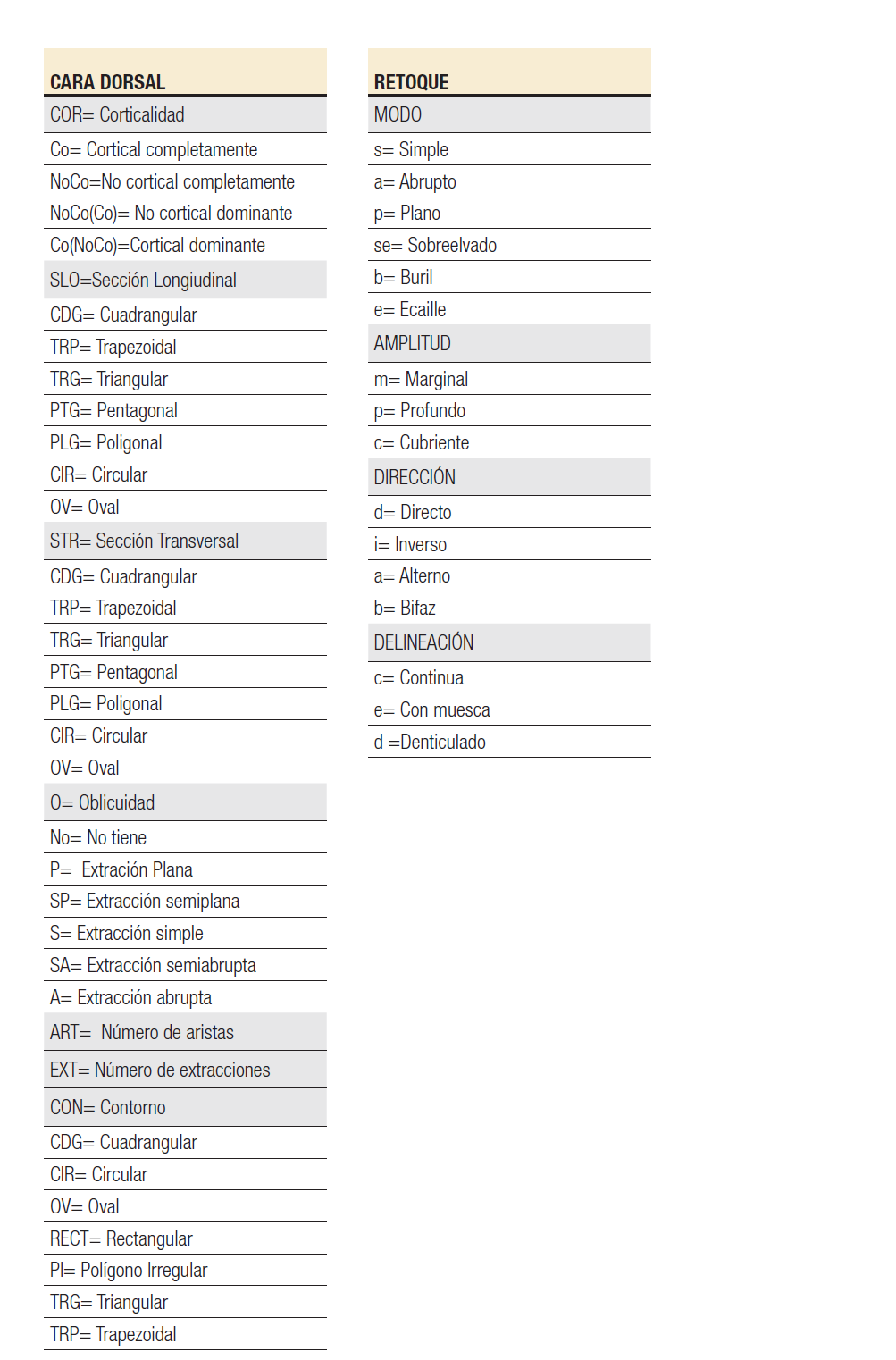 De este modo en la Tabla 1 presentamos los criterios y abreviaturas utilizadas en este estudio, correspondientes a los ejemplares de BN1G-Núcleos. En este sentido se consideran materia prima, rodamiento, color, pátina, carácter termoalterado, tipos de núcleos, tipos de bases negativas, carácter facial, carácter centrípeto, carácter de oblicuidad, carácter de profundidad, características de la arista frontal, de la arista sagital y de los tipos de temas operativos técnicos indirectos. Estos datos los podemos comprobar en (Tabla 1 y los datos concretos del estudio analítico de los ejemplares de BN1G estudiados de Puerta Califal, en Tabla 7).