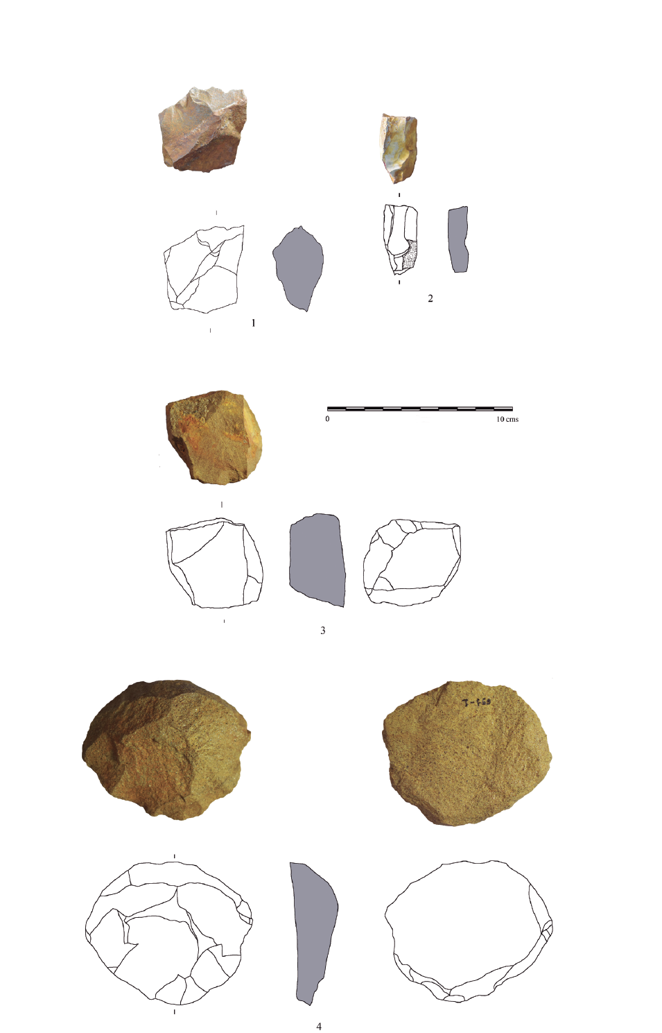 Fig. 7. BP-Lascas y láminas. 1. Nº727 (BP-D-De descortezado); 2. Nº810 (BP-D-De descortezado); 3. Nº815 (BP-I-Interna) 4. Nº707 (BPI-