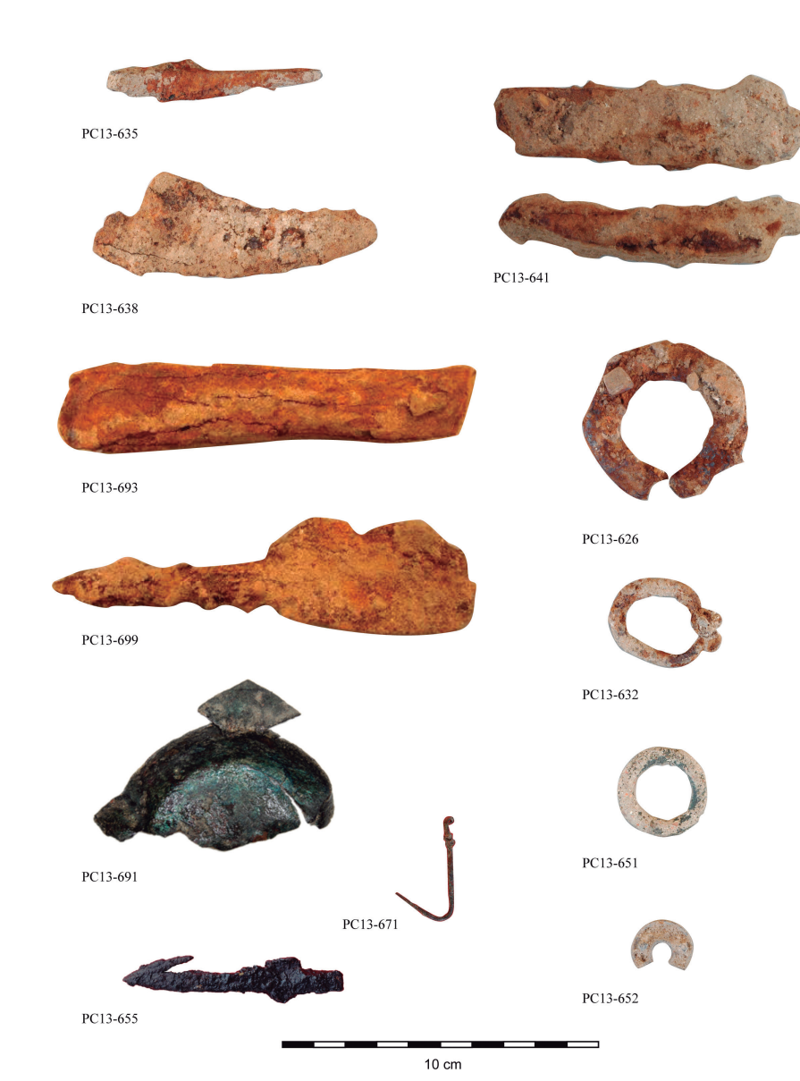 El mango de cuchillo presenta una extremidad curva y redondeada (PC13-679, figura 13.6) y todavía se pueden ver tres agujeros donde pequeños clavos lo habrían fijado a la parte metálica del cuchillo. La fractura del objeto se produjo en la zona del tercer agujero, de que queda poco, y es posible que hubiera un agujero más para fijar la hoja. En la superficie interior del mango se observa una tonalidad roja, que puede ser evidencia del metal al que estaba fijado; en este caso, podría tratarse de una hoja de hierro. En este conjunto de materiales hay también un objeto tubular de función indeterminada (PC13-615, figura 13.6).