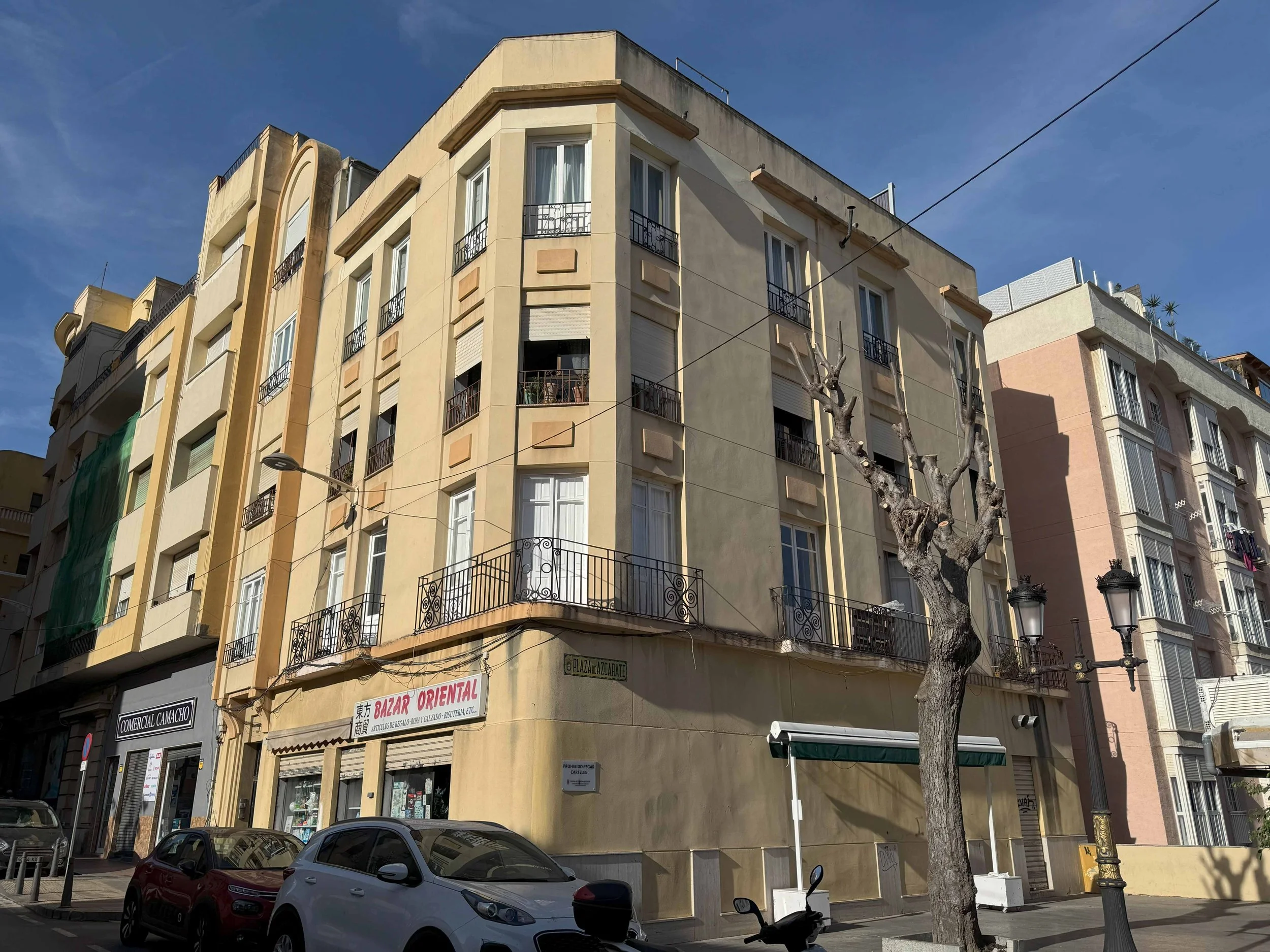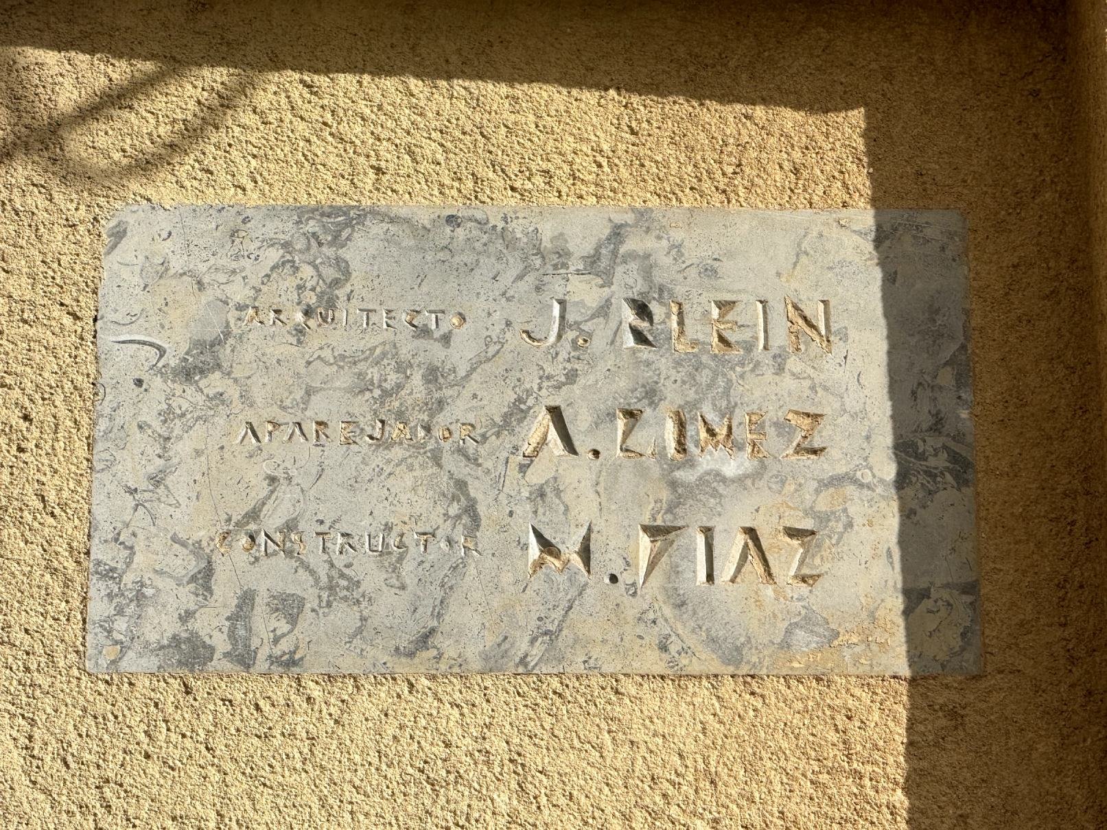 Alzados del proyecto original redactado por el arquitecto José Blein, 1934. Archivo General de Ceuta. Fotografía de la placa indicativa con el nombre del arquitecto, el aparejador y el constructor.