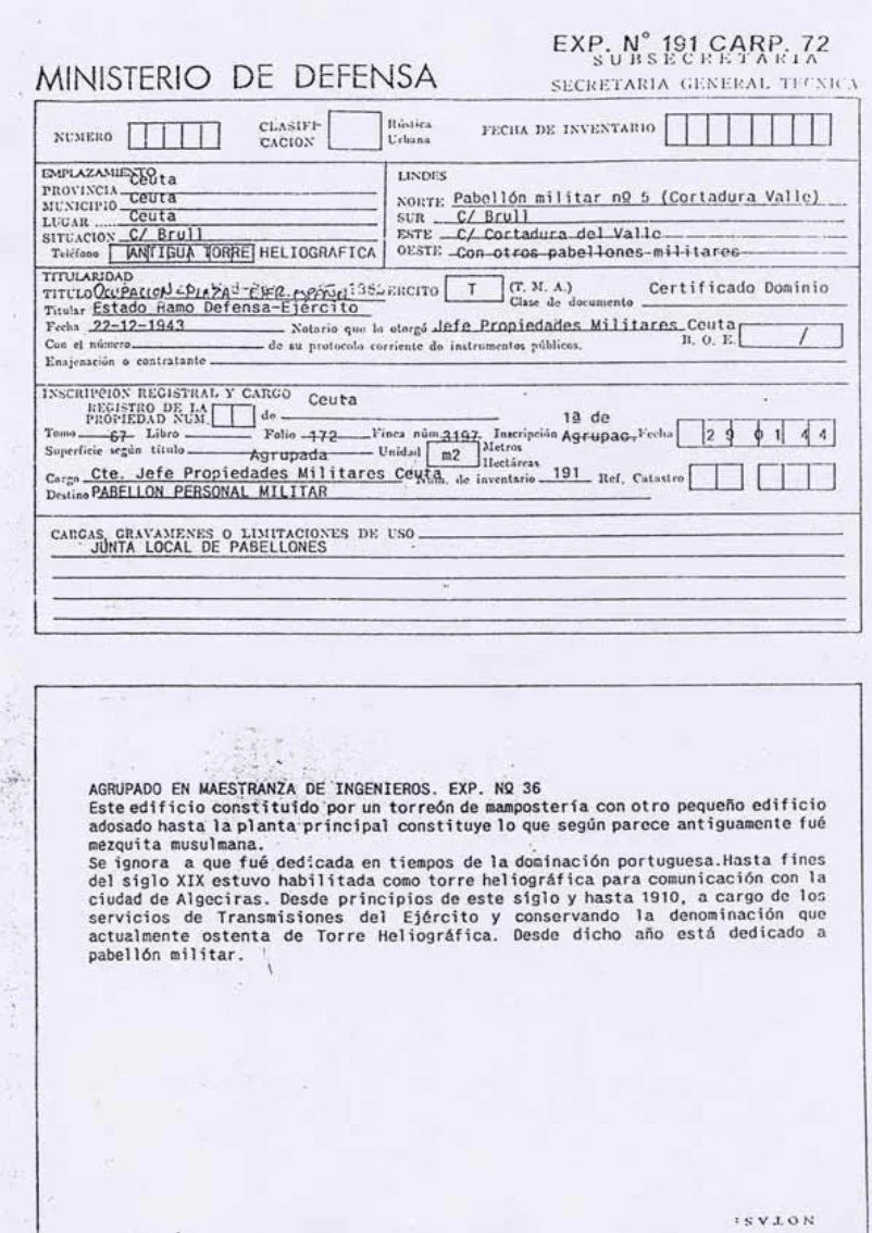 La torre del Heliógrafo constituye uno de los escasísimos restos defensivos medievales que se conservan en el conjunto de fortificaciones de la Almina. Es una obra turriforme de planta rectangular y volumen paralelepipédico que, por sus características constructivas y morfológicas, bien pudiera representar en su origen una torre defensiva exenta de uso residencial, asociada a algún tipo de explotación agrícola.