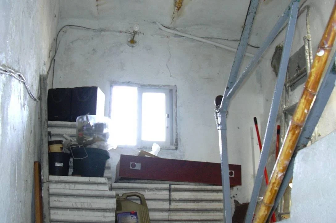 Fase 1: Cuerpo principal de la torre, con parte inferior maciza y tres plantas más castillete de escalera de acceso a terraza.