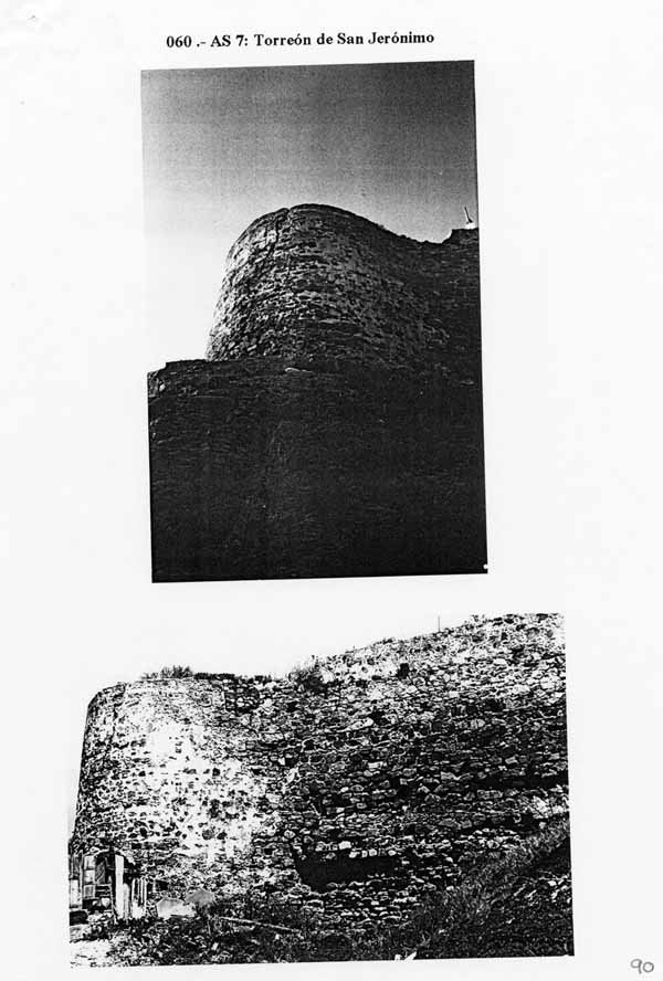 Fase 3. Posiblemente entre 1751 y 1757, coincidiendo con la fortificación del frente sur de la Almina, se podría haber reforzado el torreón colocando alguna pieza artillera sobre el mismo. No abundan las referencias sobre este respecto, y entre ellas destacamos la cita de Madoz (S. XIX) sobre diversas baterías de esta zona, entre las que refiere “San Gerónimo”. Las observaciones de los restos conservados permitirían relacionar los vestigios de la parte alta del torreón con esta utilización, si bien es difícil precisar el tipo de pieza instalada dado lo exiguo del espacio contenido en el terrado de la torre.
