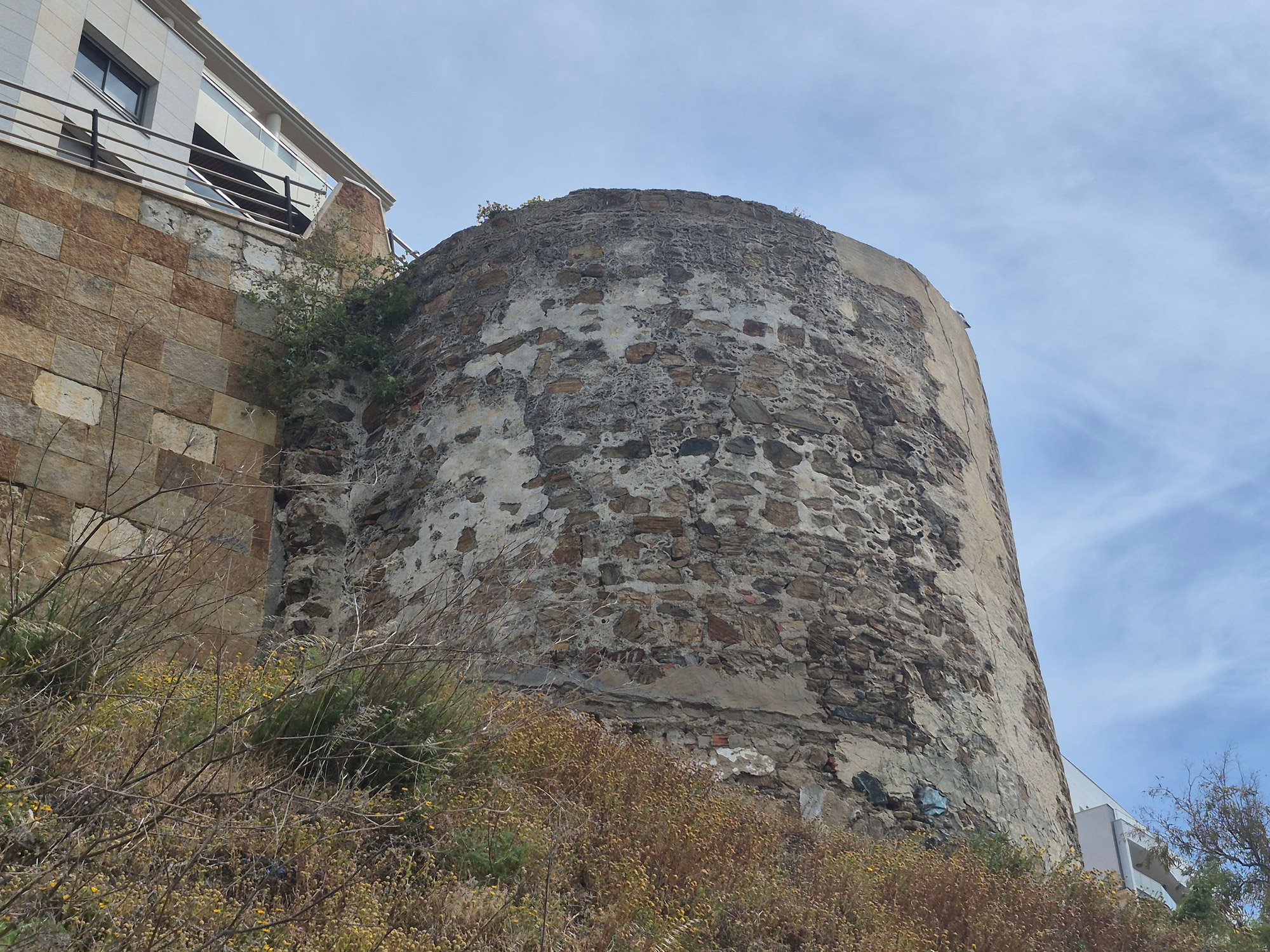 Torre de flanqueo de planta semicircular y perfil ligeramente ataludado, maciza y coronada por un pretil bajo. A ambos lados se desarrollan sendos paños de muralla de trazado quebrado para adaptarse a la topografía del lugar. Estos lienzos se rematarían con sencillos parapetos, sin que se conserve restos de merlatura, aspilleras, troneras u otros puntos de defensa específicos.