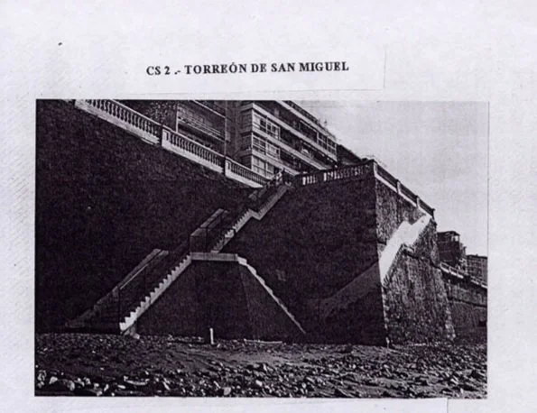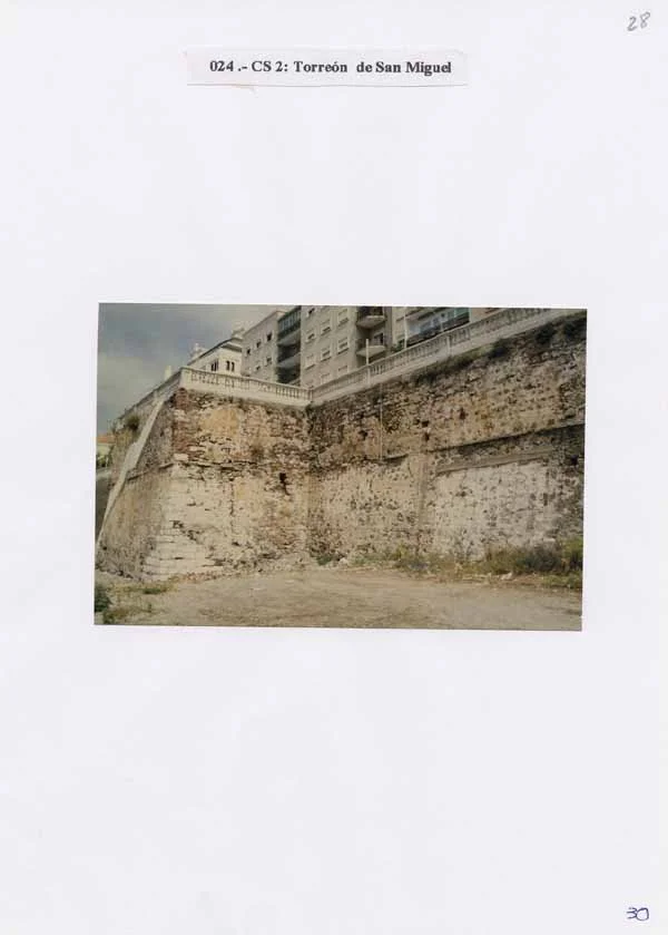 El Torreón de San Miguel posee planta cuadrangular, y actualmente le falta su último cuerpo, el cual estaría dotado de almenas al objeto de disponer en la artillería. Estructuralmente este elemento defensivo, al igual que la Cortina de la Brecha está conformado por: 1. Un primer tramo ataludado. 2. A continuación, y como remate del primer tramo una imposta o cordón magistral. 3. Un segundo tramo de sección recta. Constructivamente, tanto el primer tramo como el segundo, están constituidos por mampostería careada de gran formato tomada con mortero calizo, siguiendo hiladas más o menos regulares, incluyendo en algunos puntos ripios de forma desordenada. Todo este conjunto, estaría terminado y protegido por una capa delgada de enlucido de mortero de cal, formalizada en el tramo inferior, y dejando al descubierto la cara central de los mampuestos. Las esquinas están realizadas y reforzadas por sillares.